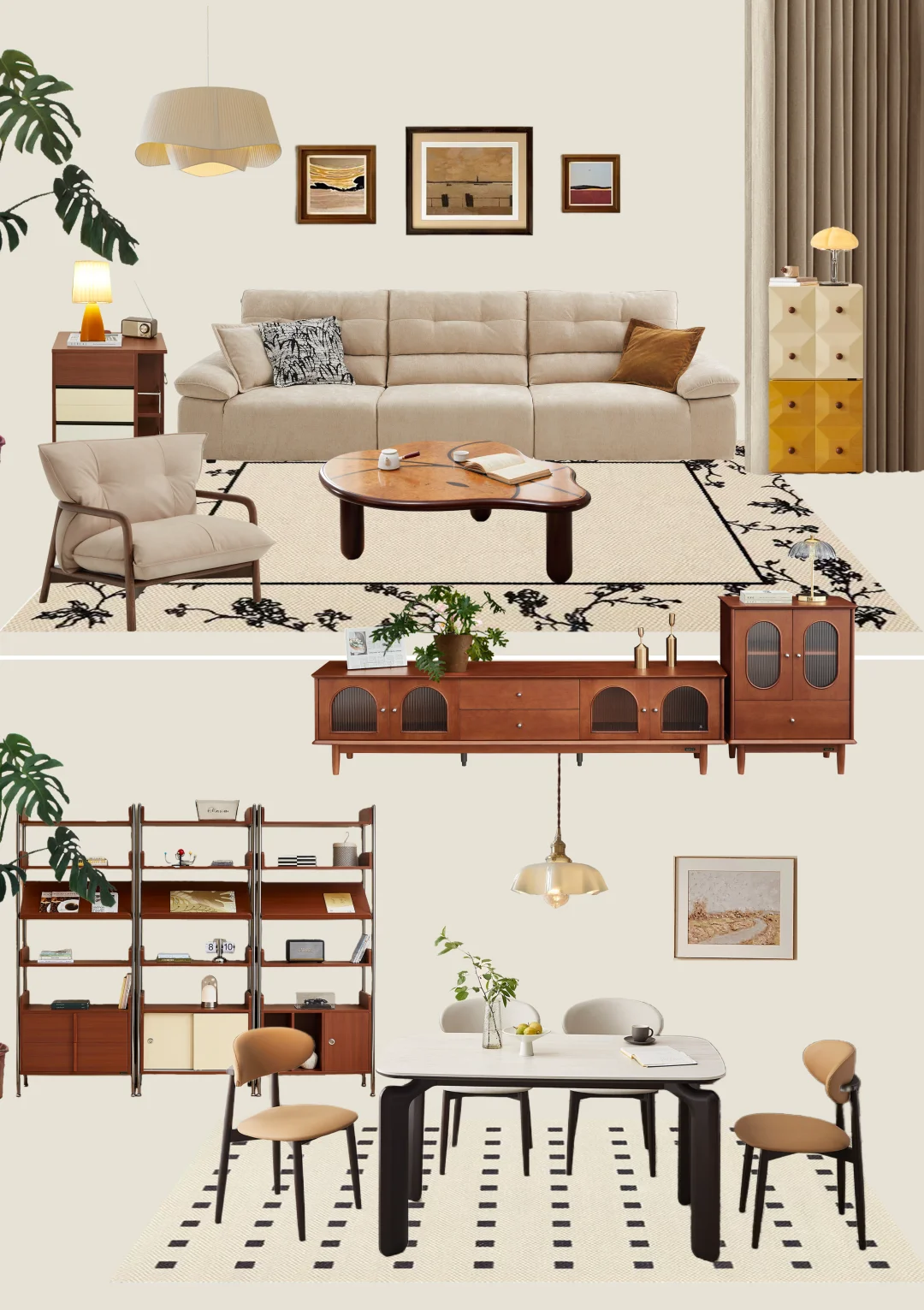 [烟花R]奶油调与中古风的木色搭配,略带一点复古的优雅,氛围感满满。奶油色作为主色调,浅色的奶油调反而凸显了中古风家具的美感,宁静且舒适,又带一丝丝的小慵懒。