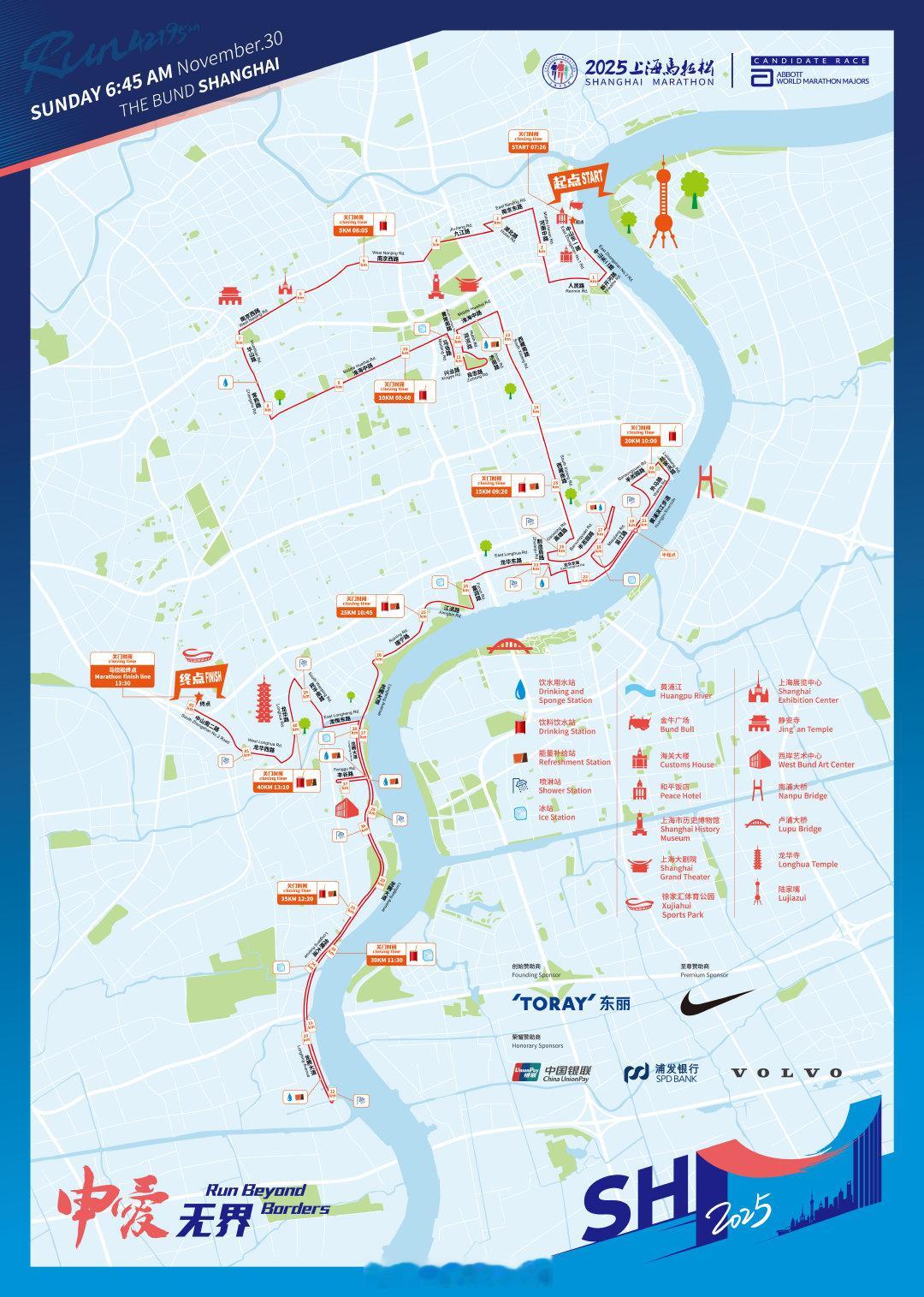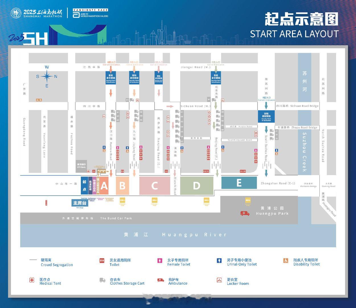 2025上海马拉松路线图,起点、终点平面图。注意到今年上马多了个“SHM”的icon(路线图右下角,起终点平面图左上角),但似乎用起来没太多讲究(竟然还能横切变形)。