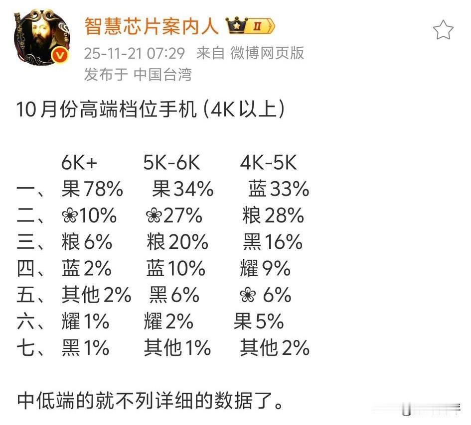 10月份高端机型价位段占比[思考]苹果最多肯定没意外的,第二是华为,第三就是小米了,6K+华为占比10%,小米6%,vivo2%,五千-六千价位段华为和小米占比会更多,这个价位段苹果就靠标准版所以占比少一些,只能说小米vivo的高端化还不错,稳步进展中[思考]