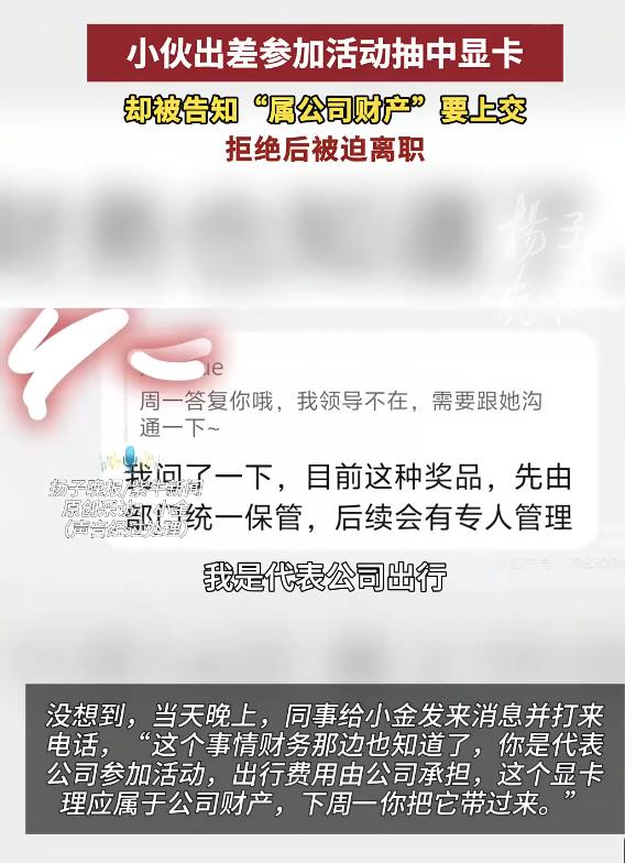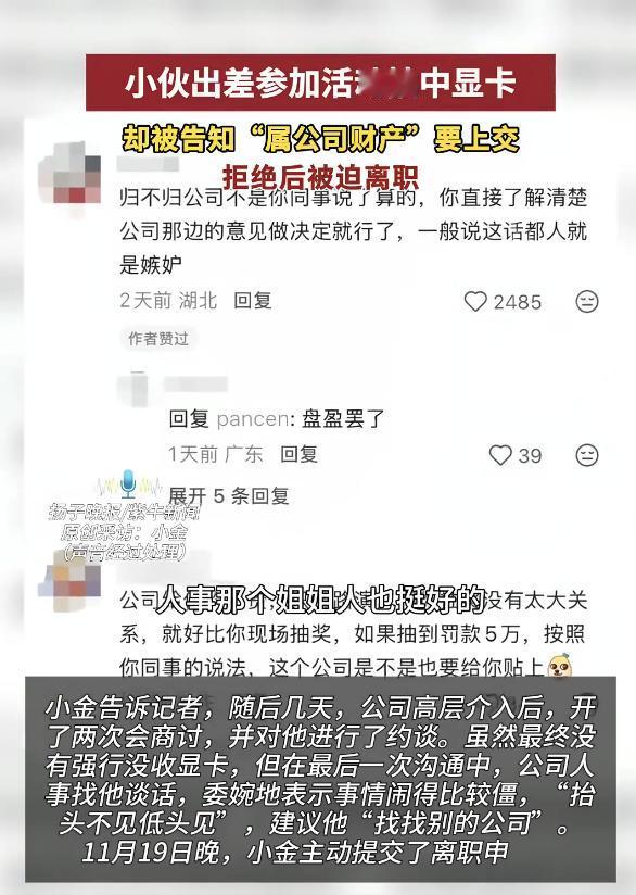 实习生出差时中大奖被要求上交,这破公司不仲裁留着过年吗? 因为是公司委派出差的,花销都是公司出的,所以中的奖也是公司的,这公司特么什么破逻辑?连运气都卖给你了? 出差的时候中奖,被公司要求上交,这换做谁都是心里一万头“草泥马”奔腾而过吧? 但因为小伙子拒绝上交奖品,结果闹的比较僵,人士小姐姐就说,抬头不见低头见的,要不你就去找找别的公司? 就这样,小伙子被迫离职了。 这还只是一个显卡,这要是买彩票中了500万,还不得被公司倒着起诉赔偿啊? 评论区竟然还有人说公司的做法没错,这是跪出新高度了啊,也太把自己当牛马了吧? 小伙子必须要仲裁这个公司,在劳动法合理的范围内要求赔偿。 你觉得公司的做法对吗?反正我也没遇到过这么下头的公司!
