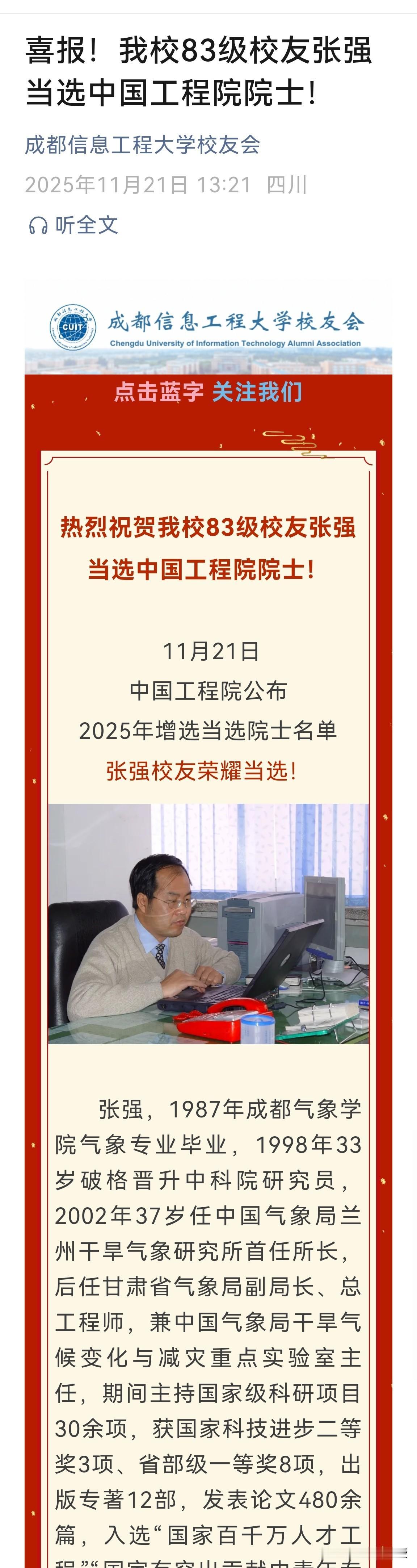 成都信息工程大学校友当选院士[赞][赞][赞] 2025年院士评选结果出炉,中国气象局兰州干旱气象研究所研究员张强当选中国工程院院士。 张强本科毕业于成都气象学院,也就是现在的成都信息工程大学。 这是成都气象学院毕业生中的第二个院士。学校马上发消息表示热烈祝贺。 学校把他大学入学通知书等档案都找出来了。 普通院校也有优秀学生,也能出人才[赞][赞][赞]