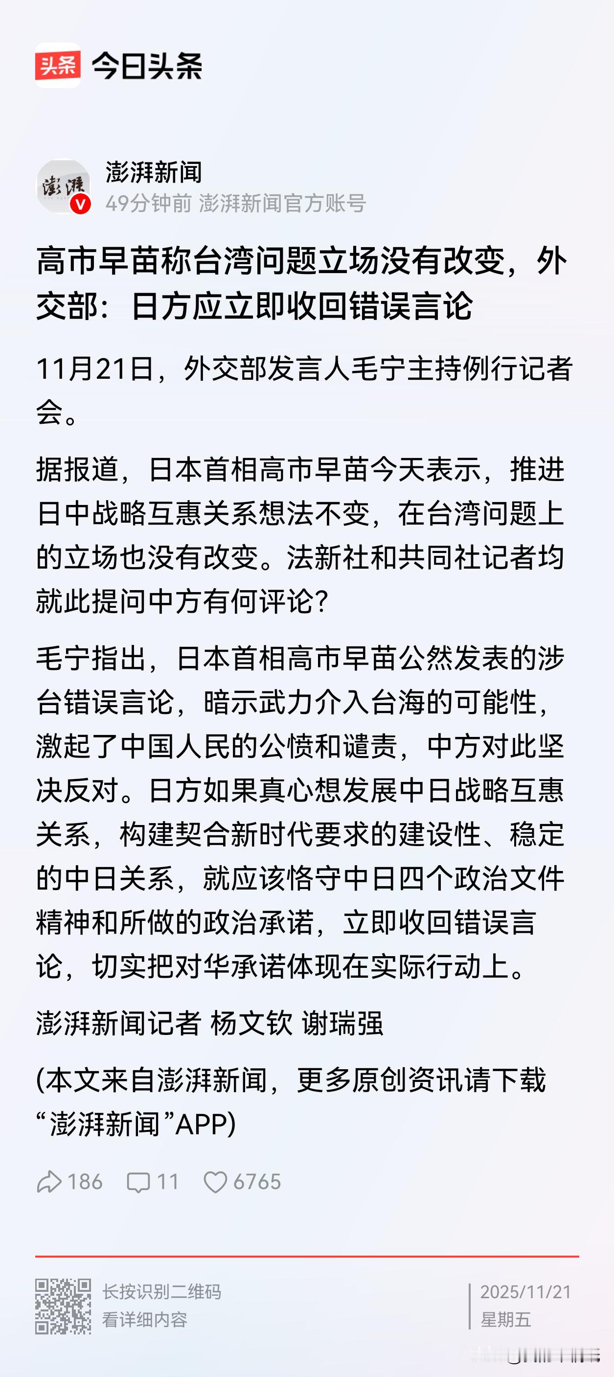 高市早苗首次回应来了!竟声称“推进日中战略互惠关系想法不变,在台湾问题上的立场也没有改变”。 简直是天大的笑话!一边奢谈“互惠”,一边死抱干涉中国内政的错误立场,这不是又当又立是什么?高的“立场”就是破坏中日关系的祸根,已激起中国人民的滔天怒火! 台湾是中国的台湾,红线就划在这里!若真有诚意,就立刻跪下认错,收回所有涉台错误言论!别妄想一边捅刀一边握手,中国人民绝不答应! 玩火者,必自焚!