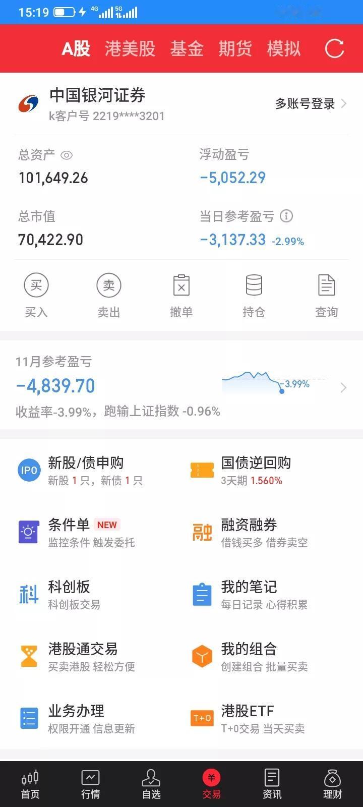2025.11.21,今天天塌了,股市全面大跌。我这次贷款真不合时宜,贷款了重仓满仓就大跌了。今天继续全面做t,买入了很多,但是全面下跌,亏得太多了,修改一下交易系统,亏了的就当加仓,不t了,等两天跌稳了,再继续做t吧。现在大跌割肉止损感觉容易割在地板上,还是再扛一扛吧。 早上集合竞价买入洪兴,三变,海陆,众生,达华,金森,天奥,立方,恒威,上能,远达,方大,神马,株冶,清源分别买入100股,买入500股韩建,500股创业板,1000股日经,1000股红利。 买入之后多只股票都上涨冲高,但是想赚多一点,都没有卖,后来都是冲高回落,不断下跌,赚钱没有卖,亏钱了更舍不得卖,就都当补仓了。 t了1000股日经,卖出价和买入价一样,一分钱都没有赚,亏了2毛钱手续费。 22.70买入100股众生,最高冲到24.47,以为会涨停,但是冲高往往是诱多,收盘跌下来了,还有一点差价,以23.41卖掉,赚71元。 其它的都冲高没有卖,都跌下来了,都是亏钱,就当补仓了,收盘以24.59元新建仓把昨天卖掉的格尔买回来100股。 这次玩大了,加杠杆重仓大跌。今天早上还浮盈一点点,到收盘大亏了3000多块,又是两只股票跌停,其它的都大跌七八个点,四五个点。 今天总市值7.04万元,总资产10.16万元,今天总体账户亏损3142元。