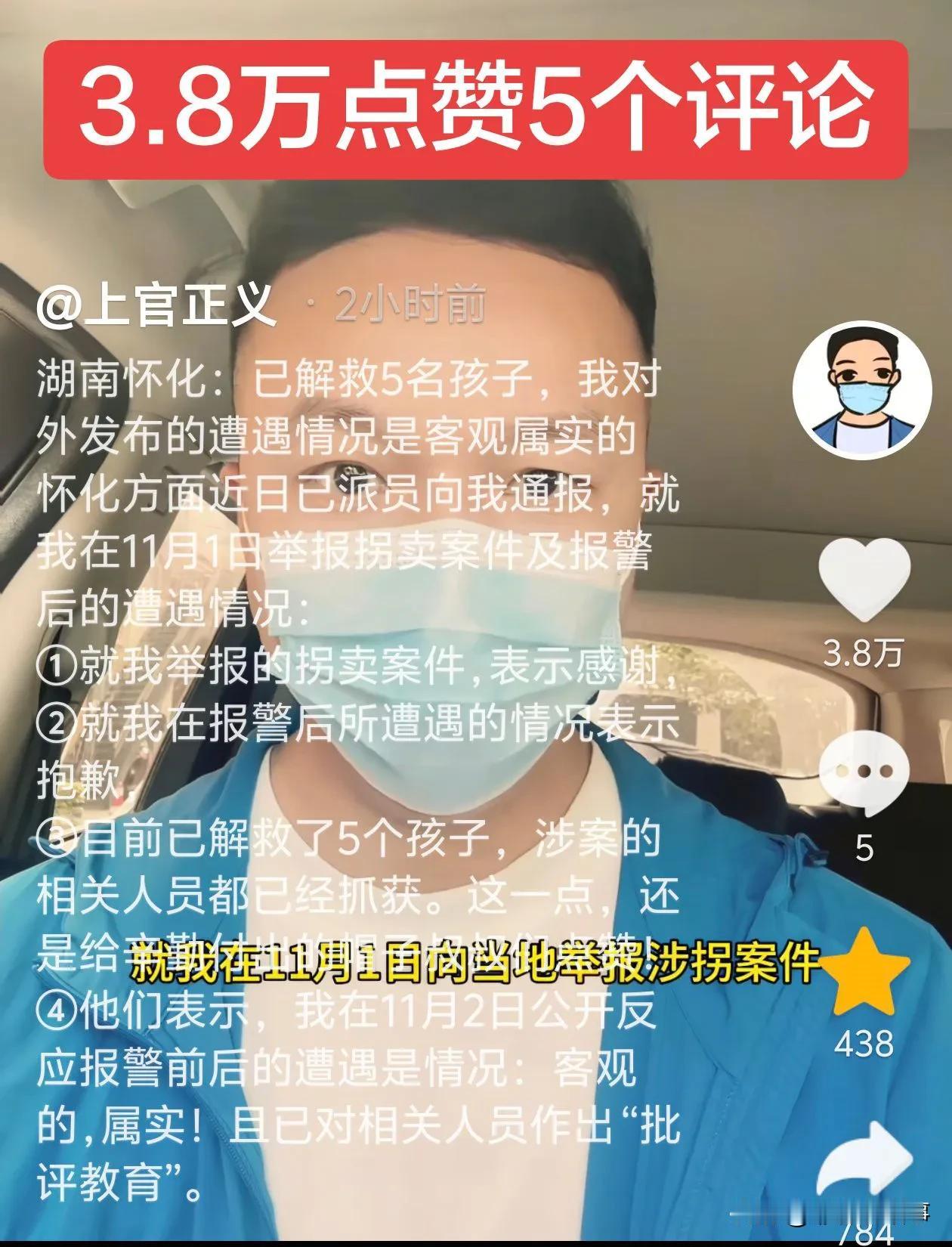 敬佩打拐志愿者上官正义,又解救5名孩子,他真是条汉子,他是全网没有人敢复刻的主播。 看到他最新的视频,他所质疑的那个地方道歉了,是谁为受拐儿童提供身份洗白,提供出生医学证明、疫苗本等,这些疑问,仍然没有人能够回答。 评论区都是让他注意安全的,一个英雄每天要东躲西藏,真让人寒心。