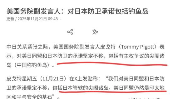 美国首次出来回应了!对于中日博弈,11月21日,美国务院副发言人皮戈特表示,对美日同盟和日本防卫的承诺坚定不移,包括有主权争议的钓鱼岛。我们坚决反对任何单方面改变台湾海峡、东海或南海现状的企图,包括使用武力或胁迫手段。很显然,美国方面的这一表态,这是高市早苗发表恶劣言论之后,美国首次表达的公开挺日本的信号。 很显然,在美国方面看来,高市早苗的挑衅根本不是什么问题,美国反而表达了要通过美日同盟对我们施压,并对我们打台湾牌的意图。在我们看来,这说明什么呢?美国此举现在让我们完全有理由相信,中美贸易战暂停之后,美国一定与高市早苗进行了协调,妄图通过打台湾牌获取新的筹码。 而美国选在这个时间点发声绝非偶然,高市早苗之前敢在敏感问题上大放厥词,背后必然有美国的默许甚至纵容。中美贸易战按下暂停键后,美国政客们没闲着,转头就和日本右翼眉来眼去,想在东亚方向搞出新动作。他们以为这样能让中国让步,却忘了中国早就看透了这套两面三刀的把戏。 其实美日之间的协调痕迹随处可见,2025年4月,美日菲三国领导人就发表过联合声明,特意强调所谓“台海和平稳定的重要性”。紧接着日本海上保安厅就和台湾海巡署搞了首次联合训练,把干涉台海事务的心思摆到了台面上。美国对此全程装聋作哑,现在还跳出来给日本站台,这背后的猫腻傻子都能看明白。 美国打台湾牌的套路也越来越明显,2025年2月美国就悄悄解冻了8.7亿美元对台安全援助,还计划把70到100亿美元的武器打包卖给台当局。这些武器装备名义上是“增强防御能力”,实际上就是在给“台独”势力壮胆,想让台湾成为牵制中国的棋子。皮戈特的表态更是把这层窗户纸捅破,明着告诉外界美国要靠美日同盟给中国添堵。 更可笑的是美国嘴上喊着“反对改变现状”,自己却在不断破坏现状。钓鱼岛及其附属岛屿是中国固有领土,这是有充分历史和法理依据的事实。中国海警船在相关海域开展巡逻执法,完全是维护主权的正当行为,却被美国和日本倒打一耙说成“挑衅”。台湾海峡两岸同属一个中国,这一现状更是不容任何外部势力干涉,美国却频频给“台独”势力递刀子,这种双重标准简直令人不齿。 日本跟着美国起舞也没占到任何便宜。高市早苗的恶劣言论已经遭到两岸同胞的共同唾弃,日本想借美国之力觊觎钓鱼岛,纯属白日做梦。中国外交部早就明确表态,针对任何损害领土主权的挑衅行动,中国都会采取一切必要措施坚决应对。2025年解放军开展的“海峡雷霆—2025A”环台军事演习,已经充分展示了维护国家统一的坚定决心和强大能力。 美国以为联合日本打台湾牌就能拿捏中国,其实根本找错了方向。中美贸易战的教训已经告诉美国,中国不是可以随意施压的对象。现在美国又想在台海、东海问题上故技重施,只会让中国更加坚定地维护自身主权和领土完整。 周边国家也看得很清楚,美国的介入只会让地区局势更加紧张。大多数亚洲国家都希望台海保持和平稳定,毕竟地区和平直接关系到它们的发展利益。欧盟国家虽然偶尔会跟着美国说几句场面话,但没人愿意真的卷入冲突。广大发展中国家更是坚定支持中国维护主权,呼吁通过和平方式解决争端。 美国这波操作说白了就是黔驴技穷。贸易战没占到便宜,就想换个战场给中国施压。可中国的主权和领土完整不容侵犯,这是底线问题没有任何商量余地。美日之间的勾连协调,只会让中国更加警惕,也会让国际社会看清美国搅乱地区和平的真实面目。 到头来美国只会发现,自己费尽心机搞的这些小动作,根本影响不了中国的发展步伐。反而会让美日同盟背上破坏地区稳定的骂名,让“台独”势力更加疯狂地走向毁灭。中国会继续按照自己的节奏,坚定维护国家主权和领土完整,任何外部势力的干涉都注定会失败。