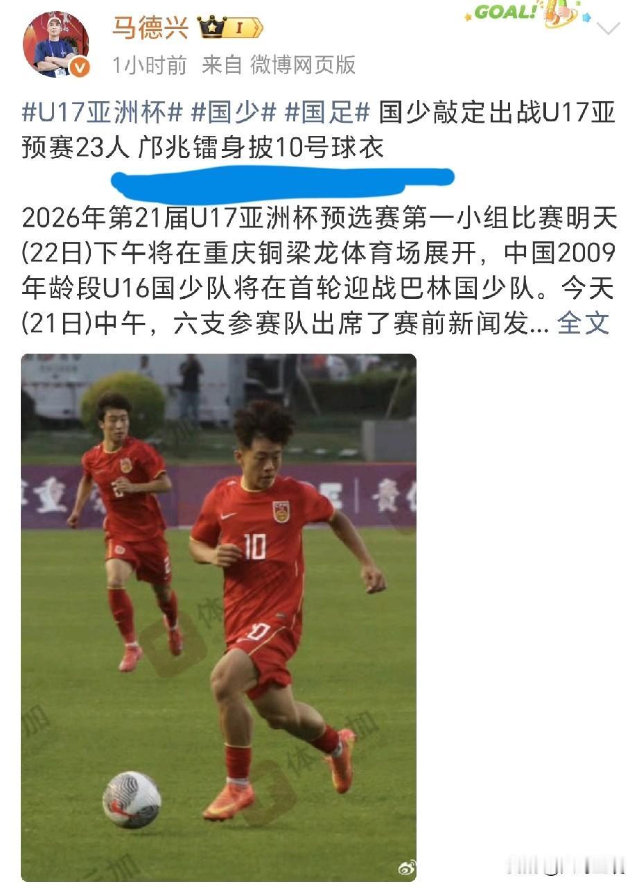 没看错!邝兆镭身披10号!《体坛周报》马德兴最新消息[吃瓜群众] 北京时间11月21日16:05,据《体坛周报》副总编马德兴传来最新消息,U17亚洲杯预选赛第一小组的比赛,将于明天在重庆正式打响,U16国少队将在首轮迎战巴林U16队[奋斗] 今天中午,U16国少队向组委会正式递交最后的参赛球员23人大名单,邝兆镭将身披U16国少队的10号出战[得意] 不过,马德兴的这个消息,却引来不少球迷的暗笑。众所周知,邝兆镭今年夏天签约西协乙莱里达竞技俱乐部,始终未能注册,从签约至今四个多月,一场正式比赛未踢。但比较搞笑的是,邝兆镭在U16国少队的球衣号码,却越来越向中场核心靠拢,从8号变成了10号[哈欠] 要知道,10号对于一支球队而言,往往都是中场核心才会去穿,类似于梅西在球队的地位,印象当中,邝兆镭在U16国少队内,好像只是一个边路球员吧?[泪奔] 如果说这支球队谁更适合穿10球衣,感觉万项的位置和近期的竞技状态,可能会更适合一些[吃瓜群众] 但如果按流量来分配球衣,那邝兆镭绝对当之无愧,妥妥的是这支U16国少队的流量担当[奋斗] 该说不说!邝兆镭穿这个10球衣,只要自己不尴尬,可能尴尬的就是别人,U16国少队中场组织核心万项穿的是19号,锋线尖刀帅惟浩穿的是21号,边路大杀器谢晋穿的是3号,不知道是不是梁静茹给邝兆镭的勇气穿10号球衣[震惊]