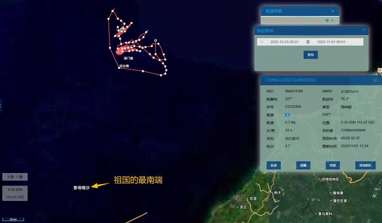 2025.11.1分享中国海警5304船在琼台礁的航行轨迹图 11月份的第一天,祖国的北方早已进入冬天,但在祖国的南沙群岛依然是夏日炎炎。当看到有我们的海警在绕着琼台礁巡逻了,心里就踏实了。 琼台礁是中国最南端的海岛,位于南海南沙群岛南康暗沙中部。它处于南海九段线的最南端,是中国最接近赤道的海岛。琼台礁距离文莱首都斯里巴加湾市仅 100 多公里,距离马来西亚加里曼丹岛海岸约 150 公里,距离马六甲海峡仅有 600 多公里,处在马六甲海峡 - 南沙海槽航线的中继位置,控制该礁可以加强对该航线的监控,对于中国的能源安全和海上交通运输具有重要意义。