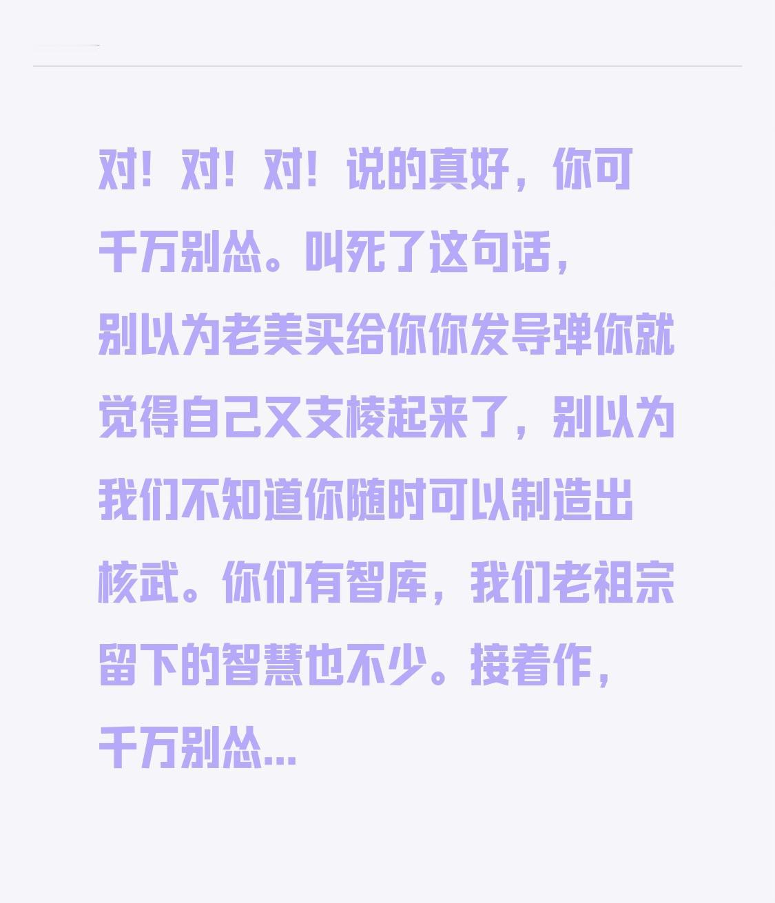 对!对!对!说的真好,你可千万别怂。叫死了这句话,别以为老美买给你你几发导弹你就觉得自己又支棱起来了,别以为我们不知道你随时可以制造出核武。你们有智库,我们老祖宗留下的智慧也不少。接着作,千万别怂,我们新仇旧恨正好一起清算,3500多万冤魂不会就这么算了。