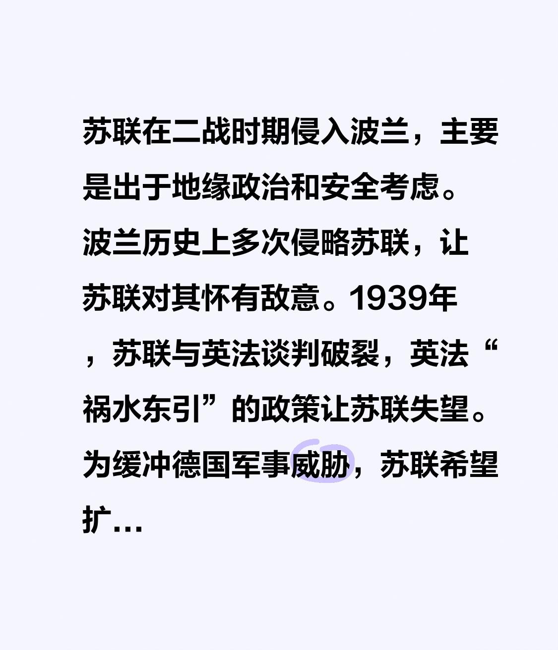 苏联在二战时期侵入波兰,主要是出于地缘政治和安全考虑。波兰历史上多次侵略苏联,让苏联对其怀有敌意。 1939年,苏联与英法谈判破裂,英法“祸水东引”的政策让苏联失望。为缓冲德国军事威胁,苏联希望扩大领土,建立“东方战线”。同年8月23日,苏联与德国签订《苏德互不侵犯条约》,划分了在东欧的势力范围,波兰东部属苏联。9月17日,苏联以“保护波兰东部少数民族”为由,出兵占领波兰东部。9月28日,苏德正式划定在波兰的边界,波兰被完全分割。不得不说,苏联这波操作是为自身安全下的一步险棋。