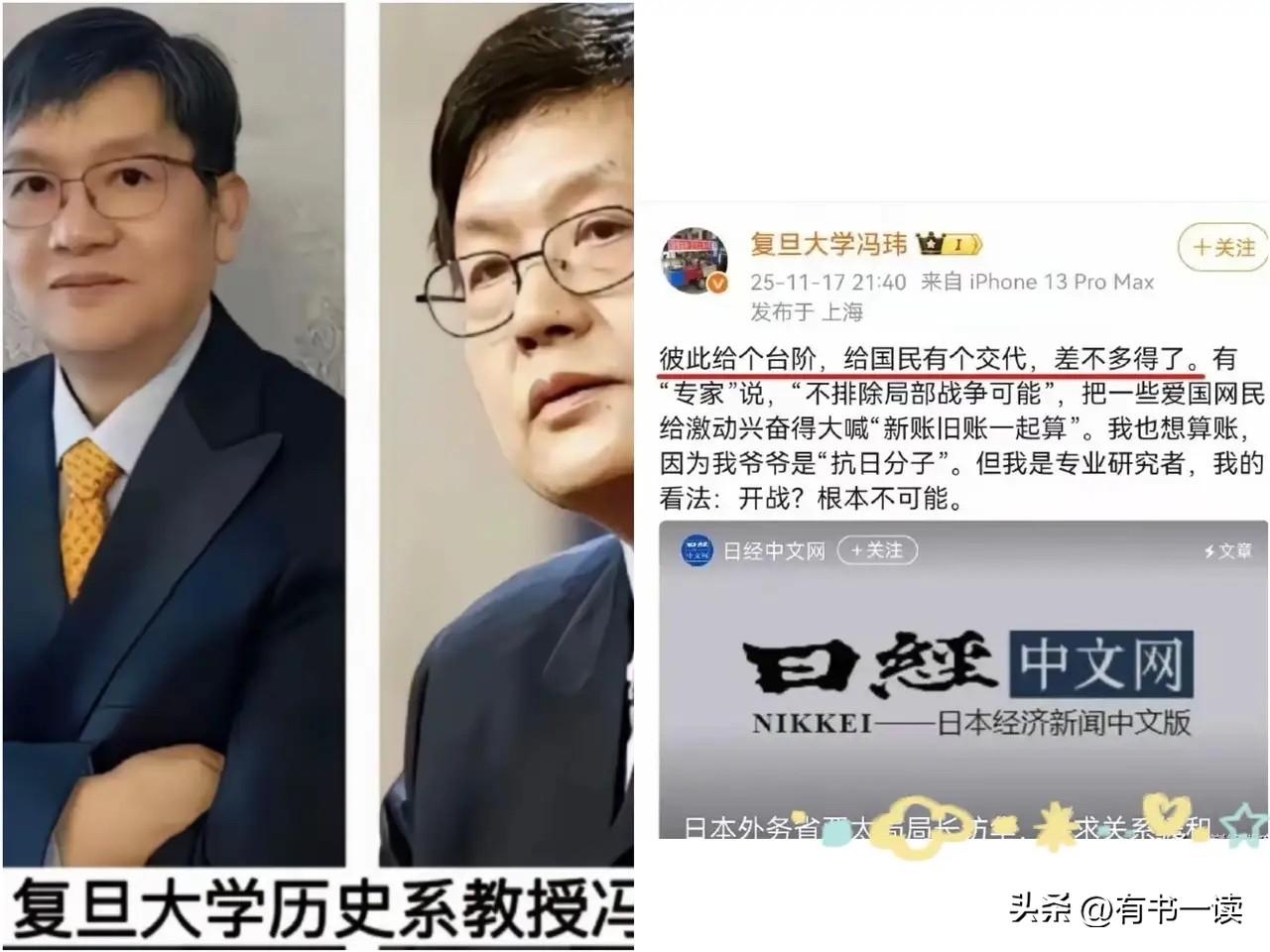 我很难理解,像“复旦教授冯玮”这种生物的脑回路。一句“差不多得了”,面对日本相关的历史争议与现实挑衅,作为拿国家俸禄的学者,不谴责加害者,反倒劝受害者“大度让步”,这操作属实让人费解! 郭德纲早说过戳心窝子的话:“我最烦那种不知道什么事,就劝我要大度的人。你知道我经历了什么?这种人得离远点,雷劈他时容易连累你。” 你想大度,可那些长眠地下的抗日先烈,答应吗?3500万同胞,答应吗?14亿铭记历史的中国人,答应吗? 学者的风骨,该是明辨是非,而非颠倒黑白”。他还能活跃在舆论场,恰恰证明我们的言论太自由,连这种离谱言论都能容下!但包容绝不等于纵容混淆是非、伤害民族感情的言论。 我们尊重不同观点,但绝不容忍有人拿着历史当儿戏、拿着民族伤痛换流量。希望所有学者都能守住底线:铭记历史不是为了延续仇恨,而是为了不让悲剧重演;言论自由不是无底线的“胡言乱语”,而是要对得起良知、对得起国家的培养! 冯玮 复旦教授冯玮