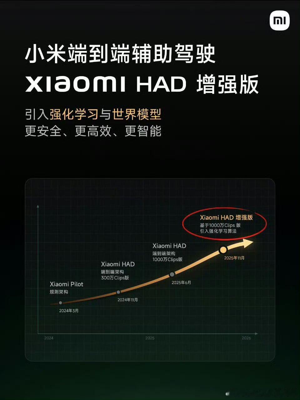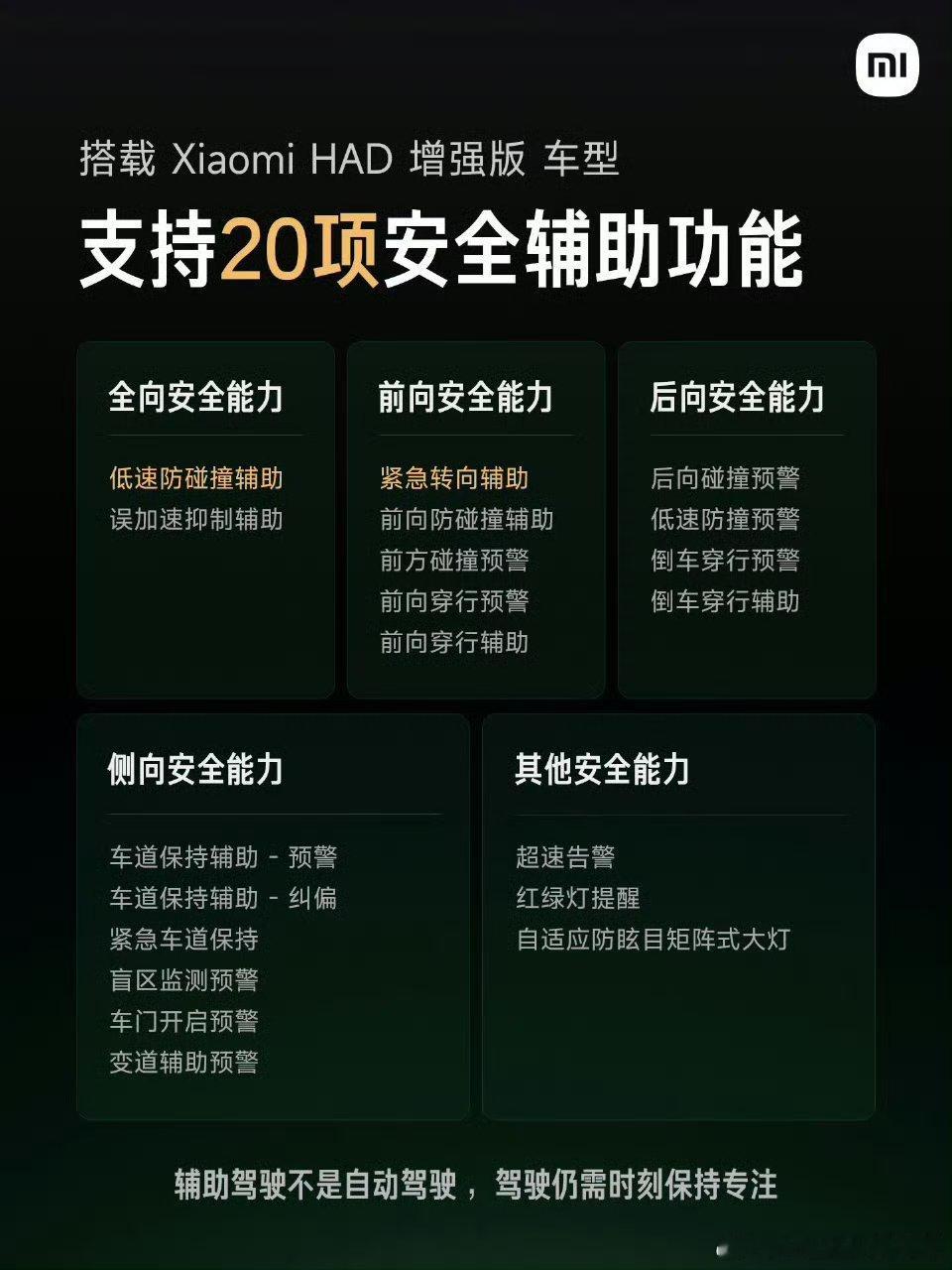 11月21日,小米在广州车展上正式发布小米HAD增强版,该版本在7月发布的1000万Clips版上引入强化学习和世界模型,并增加了多项安全辅助功能,包括低速AEB和后向AEB以及AES紧急转向辅助等等功能小米汽车还是给到建议,辅助驾驶不是自动驾驶,驾驶仍需时刻保持专注