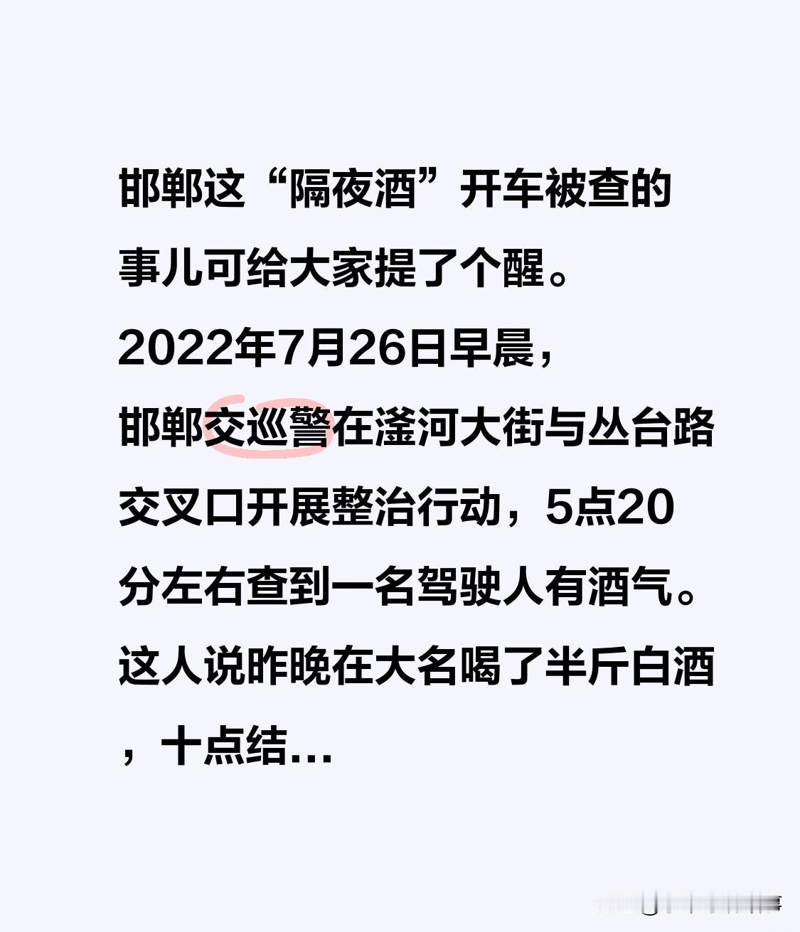 邯郸“隔夜酒”开车被查一事给大家敲响了警钟。2022年7月26日晨,邯郸交巡警在滏河大街与丛台路交叉口整治,5点20分左右查获一有酒气驾驶人。其称昨晚在大名喝半斤白酒,十点结束,今早有急事上路。检测显示,他每百毫升血液含酒精49毫克,属酒驾。柴某某也是前一晚喝酒,次日上午以为酒精代谢完,结果每百毫升血液酒精含量50mg。二人都被罚款1000元、暂扣驾照6个月、记12分。别小瞧“隔夜酒”,人醒≠酒醒!