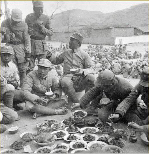 1939年4月,八路军120师在齐会地区取得一场漂亮的歼灭战胜利,击毙日军700余人。战斗结束后,部队举行庆祝胜利的会餐。 画面中,战士们身着八路军军装,席地而坐,围绕着摆满菜肴的“餐桌”用餐。每“桌”菜肴丰富多样,达15个之多,有肉类、蔬菜等品类,战士们或端碗进食,或起身交流,脸上洋溢着胜利的喜悦,不远处更多战士聚集在山地村落间聚餐。