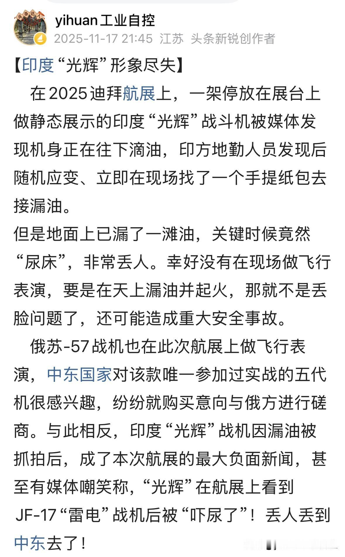 【印象战机在迪拜航展表演时坠毁】 在迪拜航展上,前几天媒体就拍到静态展示的印度“光辉”战机机身漏油,印度人胆子真大,还敢飞! 当地时间11月21日,一架印度“光辉”战机从高空俯冲而下、再也没能将机头拉起,直接以头抢地。 坠落地点冒出巨大火球、随后又升腾起黑色浓烟,但愿上帝保佑飞行员平安,坠毁原因目前尚不清楚。