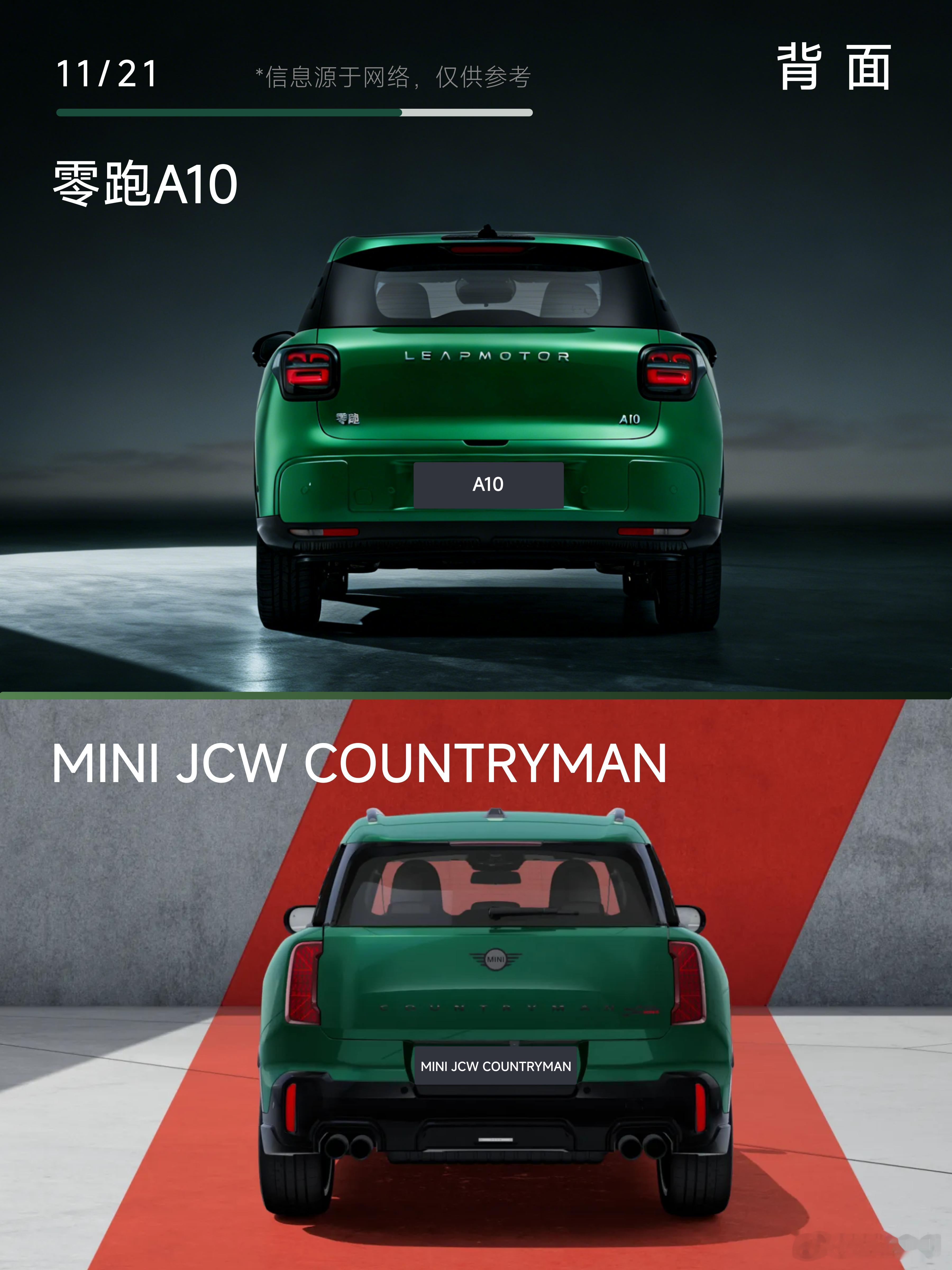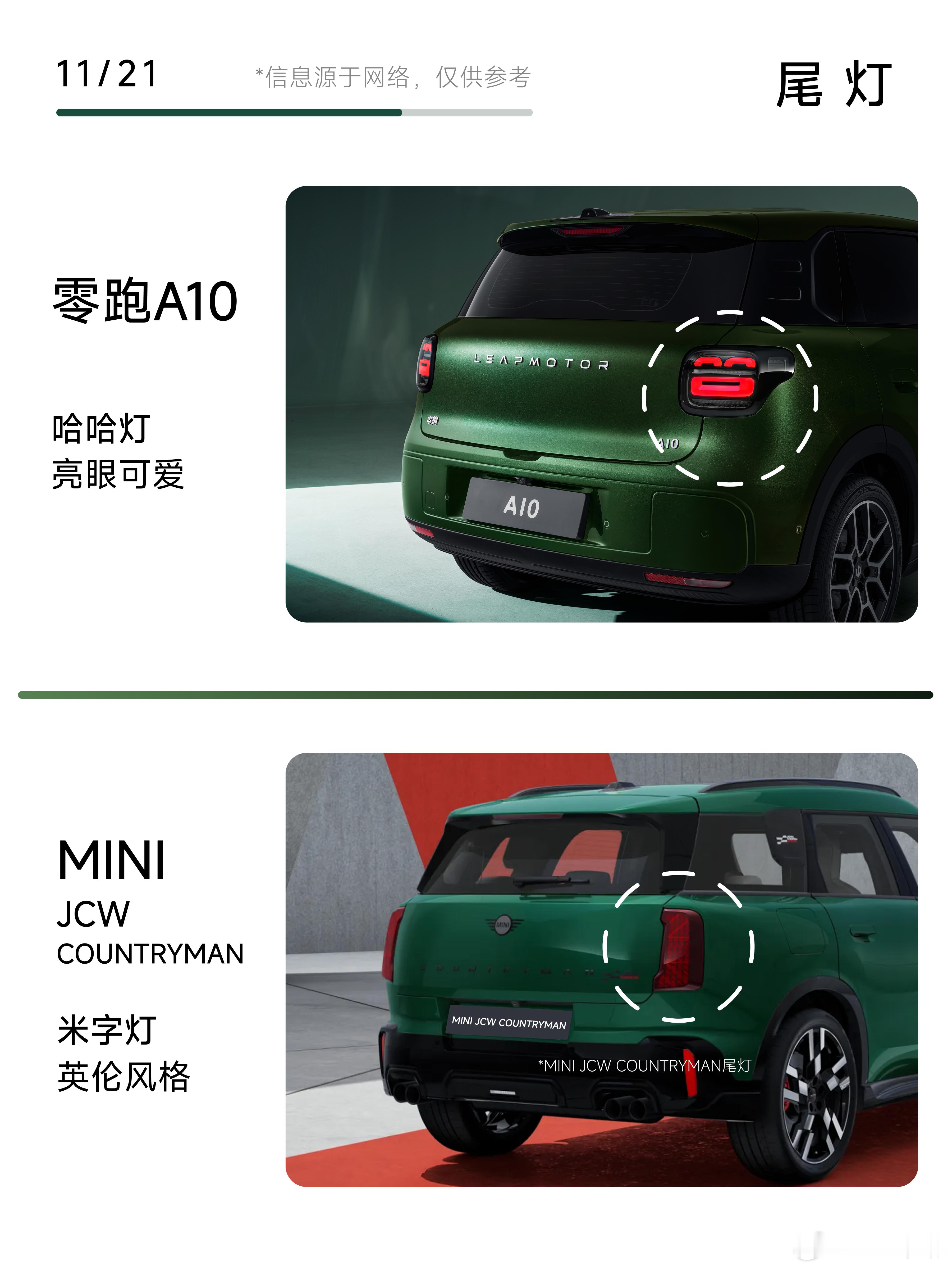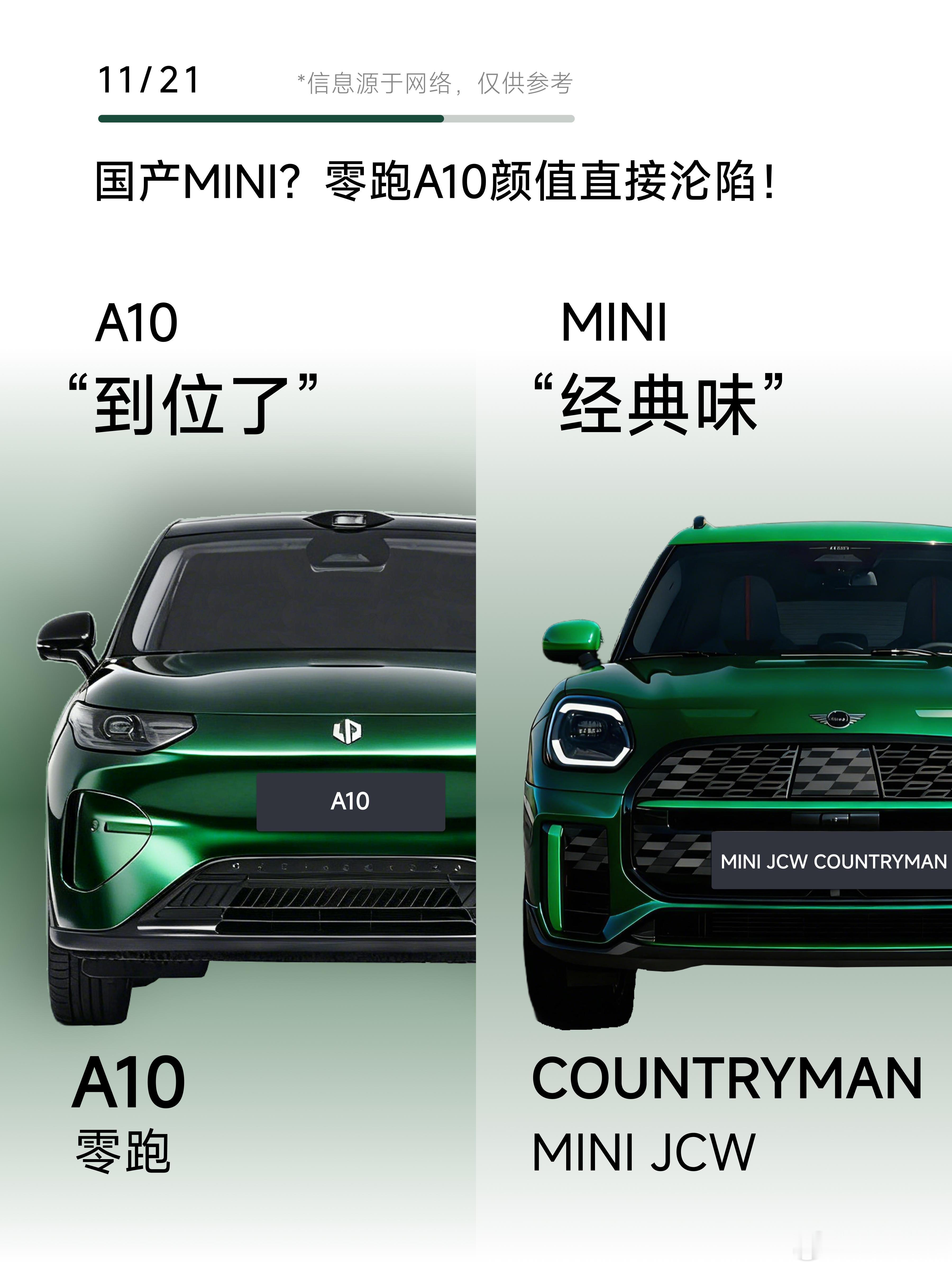 逛车展第一眼,还以为是MINI出了国产新车型!原来是零跑 A10!😂那时刻的心理动态:“A10,这风格是真到位了。”A10和MINI同框的海苔绿配色💚,直接把“撞脸”氛围拉满——MINI是古典英伦派,自带英伦经典味;A10则是现代英伦派,更偏向现代人的审美,但也融合了MINI古典的那种精致感,而且新能源的科技感也给“到位了”。正脸:先看外观,零跑A10海苔绿车身,圆润轮廓和MINI的灵动线条像“孪生款”,但A10多了点SUV的舒展感,说是“国产MINI SUV”真不夸张!车漆质感更是戳中审美,海苔绿柔和清爽,像海风裹着鲜氧,日常通勤耐脏又高级,阳光下的光泽☀️和MINI的经典配色不相上下!正侧:A10的比例真的稳,是那种“刚刚好的体量感”。属于“精致的SUV”,它更像是一款“国产MINI风格”的SUV,但走的是更利落、更线性的方向。后侧45°:细节设计藏着不少惊喜!A10的轮廓处理得干净利落,整个尾部看着特别“整”,LEAPMOTOR的标识一摆,精致SUV气质比MINI的圆润线条更鲜明。背面:这波背面“风格”也太像了吧!零跑A10和MINI这是“心有灵犀一点通”啊。只能说设计感这方面,零跑的功力的确和MINI一样深厚。尾灯差异:最绝的还是这个“哈哈灯”!看这张尾灯图——A10的两道弯弧+一条横线,直接组成了咧嘴笑的笑脸造型,刹车亮起来像在跟你打招呼,治愈感拉满;对比MINI的英伦风尾灯,多了新能源俏皮科技感。A10 其实没有模仿谁,因为它有着独属于“精致都市 SUV”💫的风格。 对比 MINI ,反而能更看出它的“经典到位”与“现代精致感”。如果你本来就喜欢 MINI 那种紧凑、精致、年轻的气质,那A10真的是同频用户的一款新选择👍。属于 “更实用、更现代,但气质又挺 MINI 的国产 SUV”了。