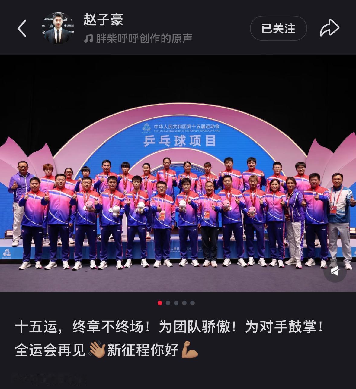 赵子豪总结全运会:十五运,终章不终场!为团队骄傲! 为对手鼓掌👏, 全运会再见, 新征程你好! 上海队超级给力, 跟樊振东一起开启新征程! 赵子豪也是一位很棒的 球员, 他有自己的比赛和训练计划, 之前是情况特殊, 赵子豪与樊振东互相帮助, 现在时移势易, 赵子豪也将回归自己的主线, 祝他们在每一个赛场 顽强拼搏,再创佳绩! 不忘初心的赵子豪在 全运会 打进男单8强后哭了,性情中人, 太让人动容, 希望豪哥继续快乐乒乓球, 继续加油, 希望赵子豪 樊振东 许昕 周恺 再 战全运会! 四年后再战!