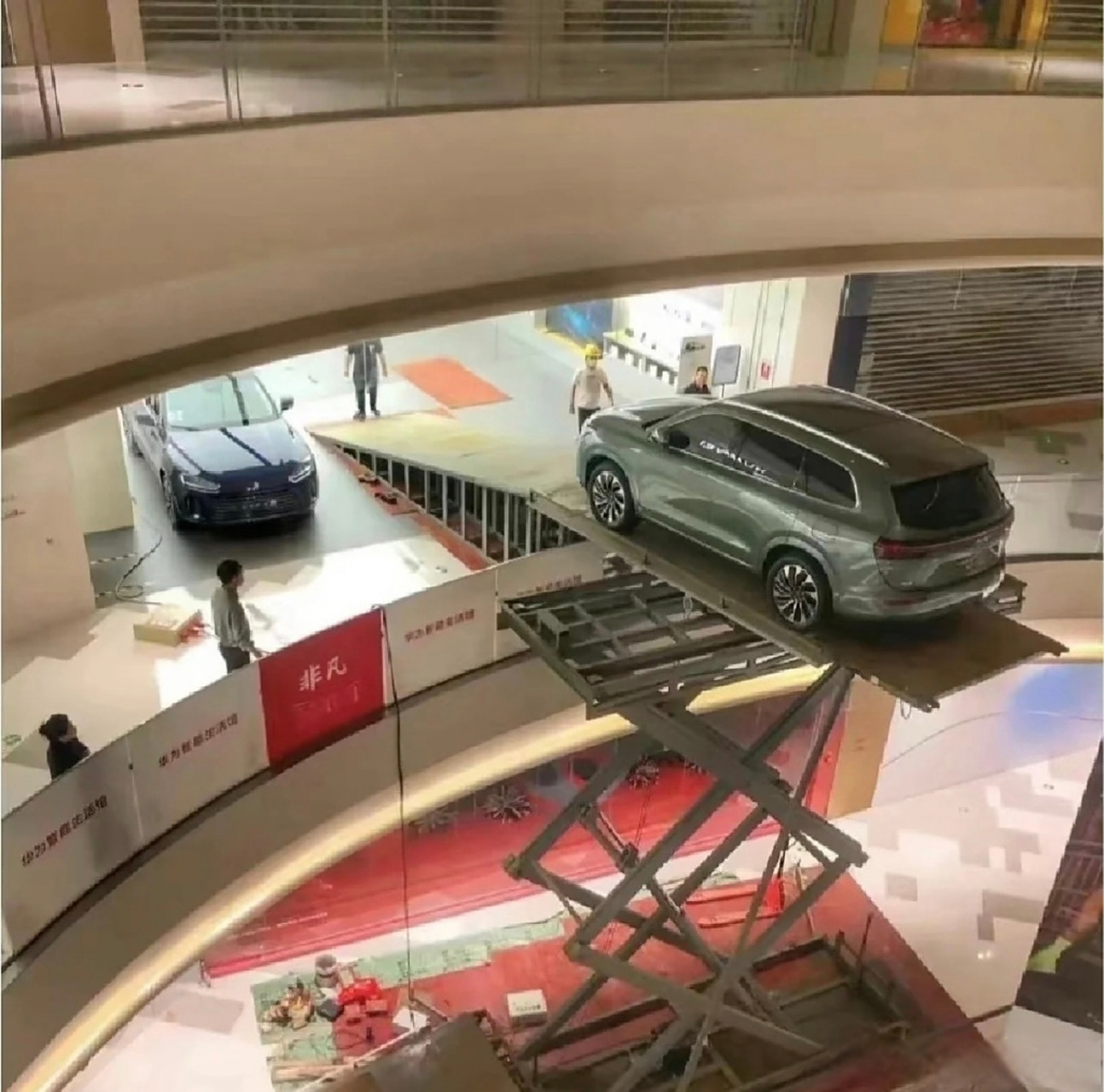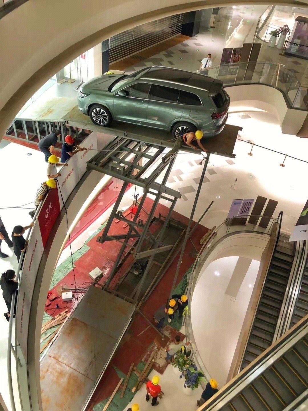把车弄到一楼以上才是最麻烦的工程,这种情况都得等商场晚上下班了才能施工