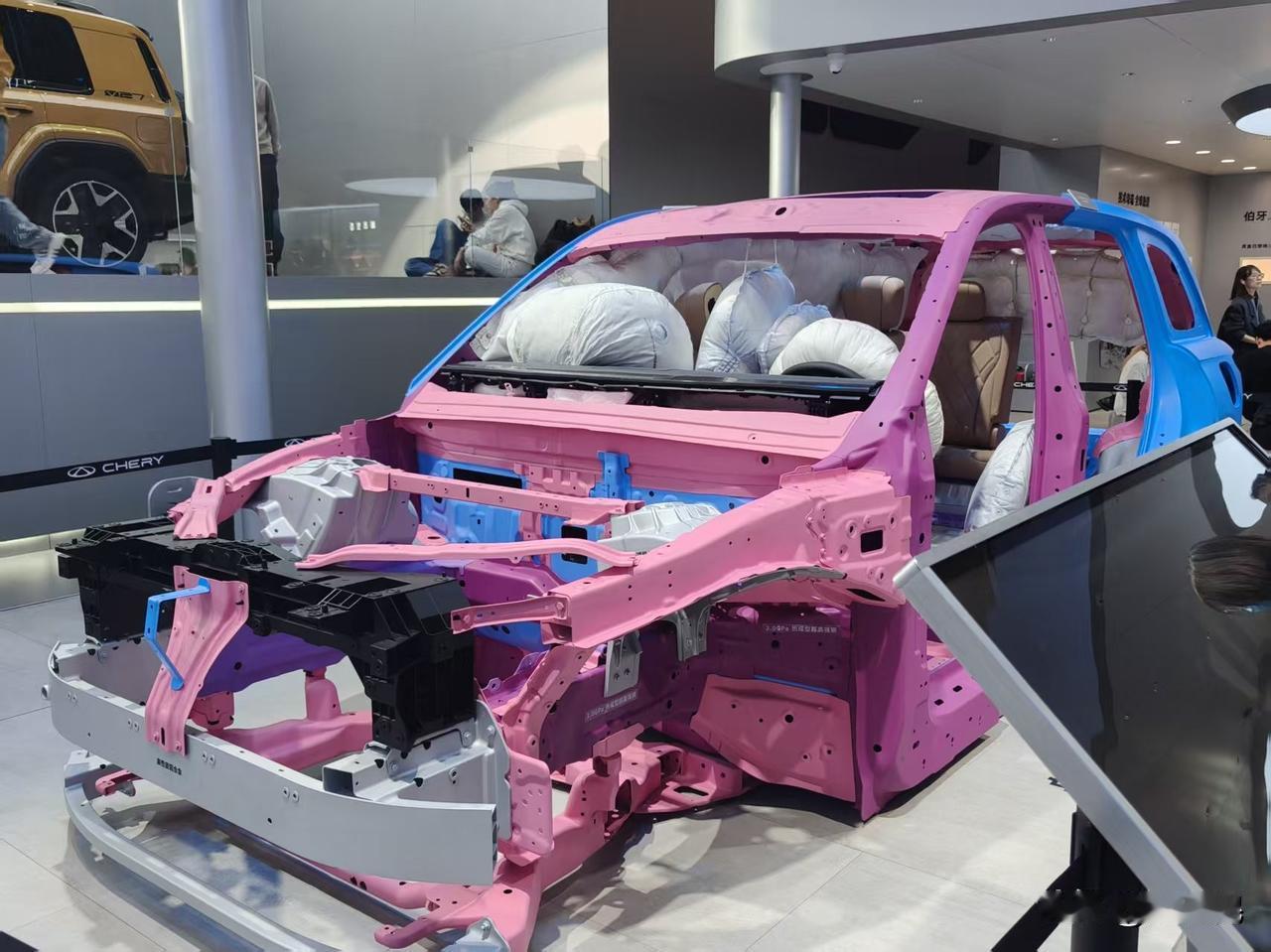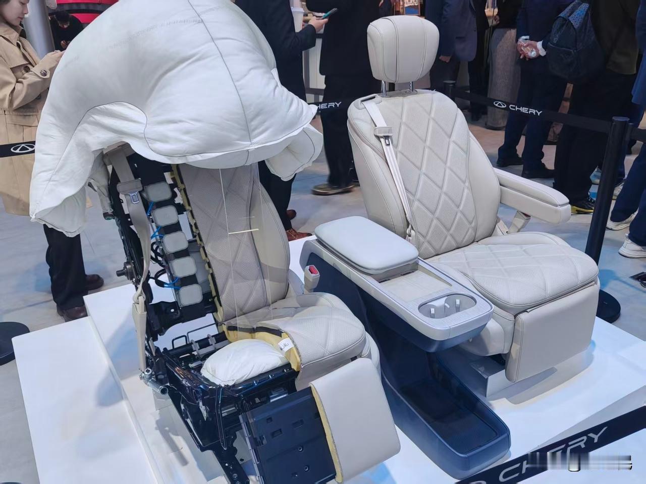 共34款车参展,还有风云A9、iCAR V27、风云T9L正式亮相 、纵横G700环塔版上市。 李总在现场透露,奇瑞风云T9L在2026年3、4月上市,风云A9在2026年Q2季度上市,全新QQ3也将在年底的QQ之夜发布会上正式亮相。 除了众多重磅车型亮相之外,奇瑞带来了磐石车身2.0、飞鱼数智底盘i、真金白银扬声器2.0等展品。 其中最感兴趣的是奇瑞展台,亮相的一套座椅,成品有扶手和腿托,半裸露状态下,头部有安全气囊,打开后可以把人的整个头部包裹住,安全感十足。