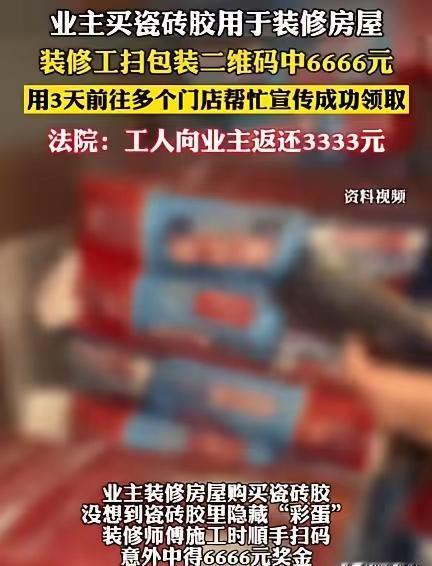 装修工扫瓷砖码意外中奖2万,房东上门讨钱!法院判决出人意料 谁能料到,贴瓷砖也能贴出好运气?湖北咸宁的装修工王某就遇到了这样的奇事。他在为业主李某装修时,顺手扫了瓷砖包装上的二维码,没想到这一扫竟然中了2万元红包,还额外获得了6666元现金奖! 如果是一般人,可能就暗自高兴完事了。但业主李某知道后却不乐意了:这瓷砖可是我花钱买的,中的奖当然应该归我!两人为此争执不下,最后竟然闹上了法庭。 法院审理后发现,虽然瓷砖确实是李某购买的,但扫码中奖这件事与瓷砖的所有权并没有直接关系。法官认为这属于“射幸合同”,说白了就是全凭运气。最后,本着公平原则,法院判决王某退还一半奖金3333元,王某当场就把钱转给了李某。 这件事在网上引发了广泛讨论。有网友表示:“要是没有师傅扫码,这奖不就浪费了?”也有人认为:“房东出钱买瓷砖,中奖归他也合理。” 在我看来,这个判决确实体现了公平原则。既没有让师傅白忙活,也没让房东完全吃亏。生活中这种“意外之财”还真不少,关键是要理性对待,该是自己的就拿,不是自己的也别强求。 话说回来,如果你遇到了这种情况,你会怎么处理?是像师傅一样先扫码中了再说,还是主动把扫码机会让给业主呢?