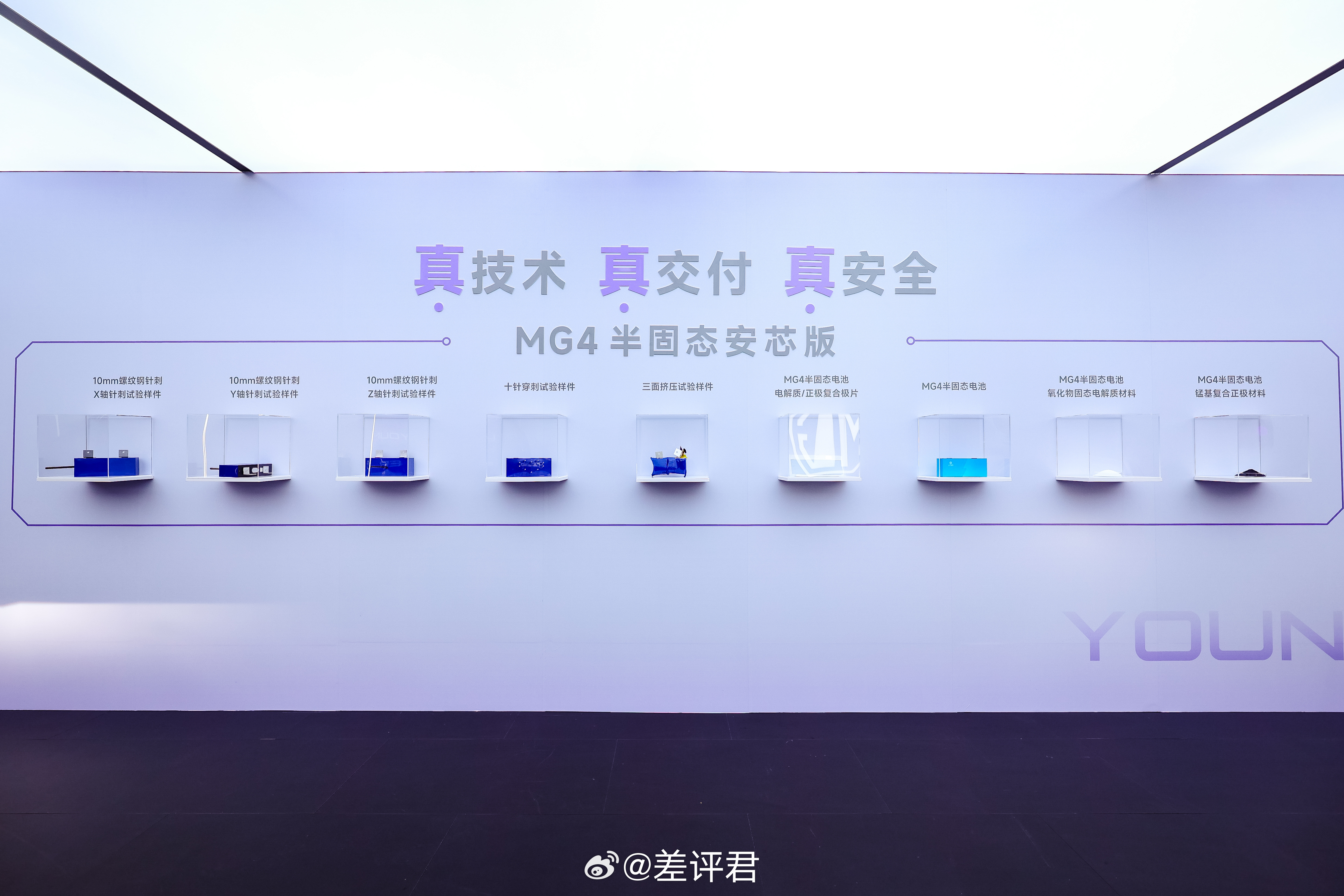 为什么车企、电池厂家都死磕固态电池?除了众所周知的能量密度,还有一个很重要的原因是固态电池的安全性。固态电池用到的陶瓷、聚合物电解质材料不挥发、不可燃,从源头上就杜绝起火爆炸诱因。而且,固态电解质本身还能阻挡充电时锂金属沉积形成的“锂枝晶”刺穿电极隔膜,避免内部短路引发热失控。同理,就算是半固态,因为液态电解液含量仅为传统锂电的10%-30%,且通常会搭配阻燃剂,哪怕高温分解,也没多少东西可烧。同时,固态或凝胶态的电解质也能阻挡锂枝晶生长,胶状电解液也不具备太强的流动性,降低了漏液风险。这次广州车展MG名爵展台,新形象展示了MG4 半固态安芯版上半固态电芯的强悍安全性,能通过1厘米粗螺纹钢的x、y、z三轴穿刺实验,10针穿刺实验,三面挤压实验。9.98万元的定价,也打破了半固态就一定卖高价的认知,真正做到了科技普惠、安全平权。