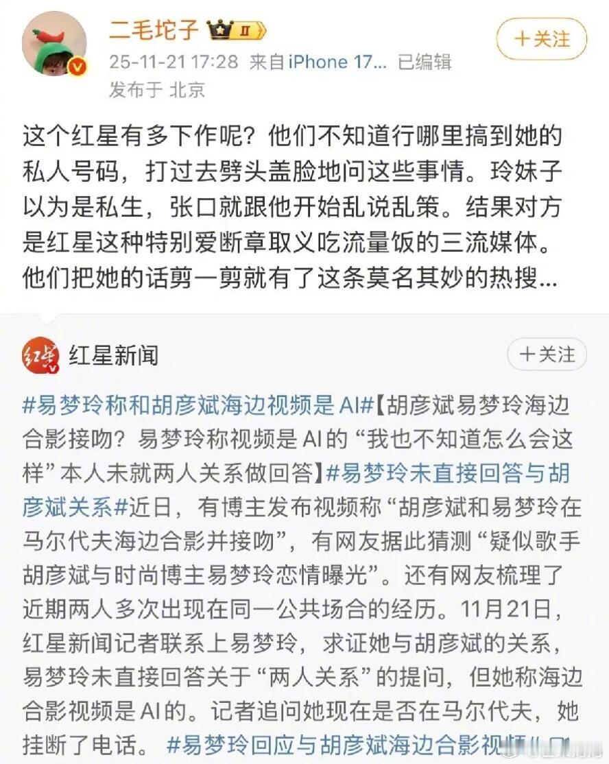 易梦玲称和胡彦斌海边视频是AI易梦玲好友回应易梦玲说视频是AI的原因:以为来电的是私生
