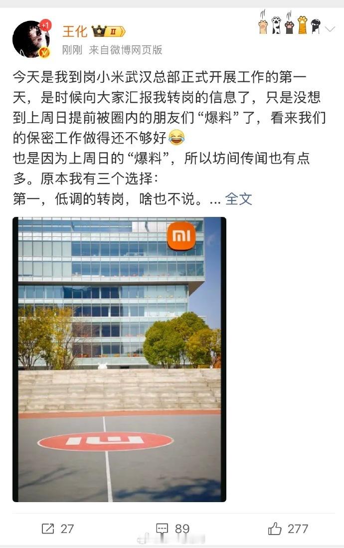 小米王化发长文官宣转岗。同时称去武汉是正常的轮岗。
