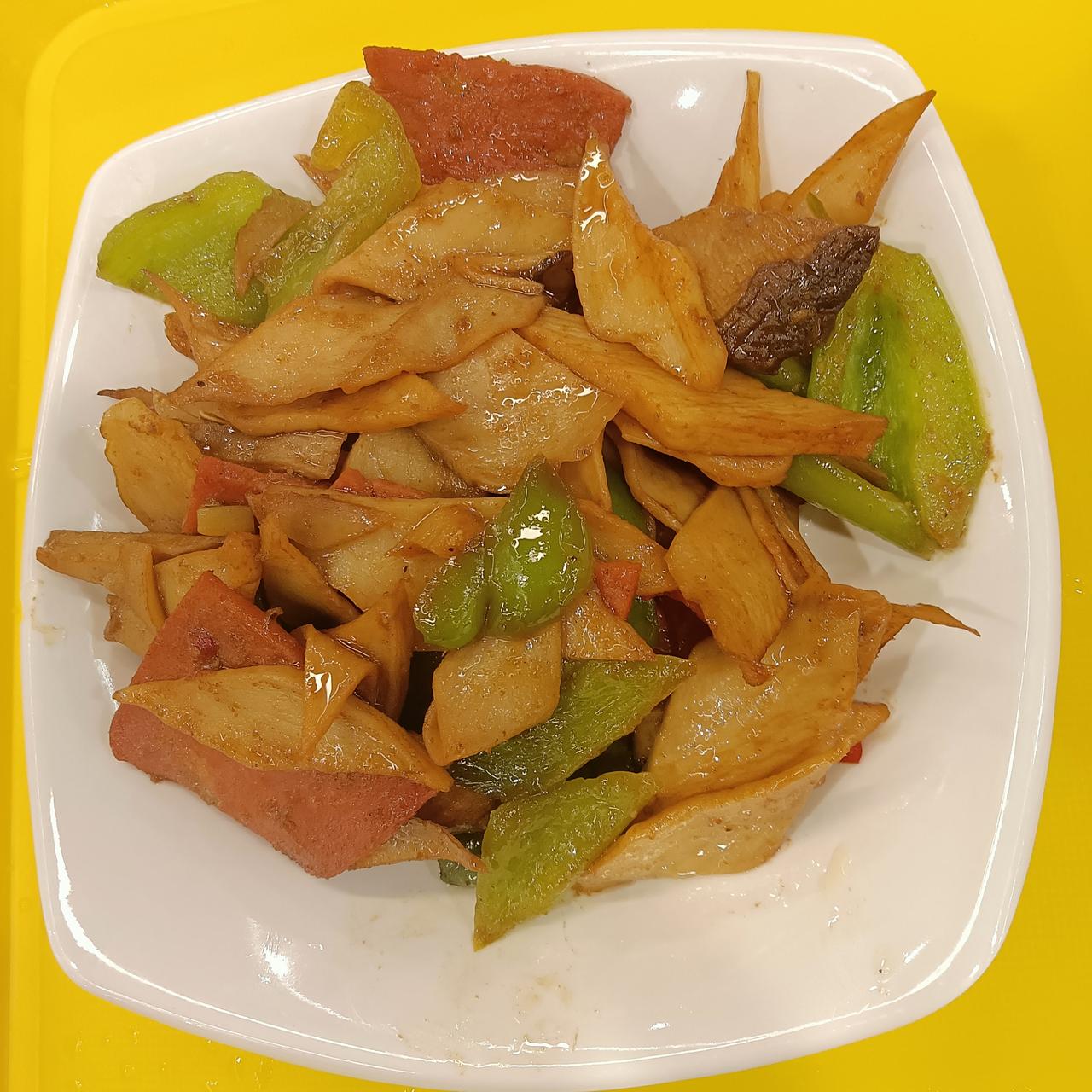 大家猜一猜,这一盘菜多少钱?几片火腿加上蘑菇和青椒。
