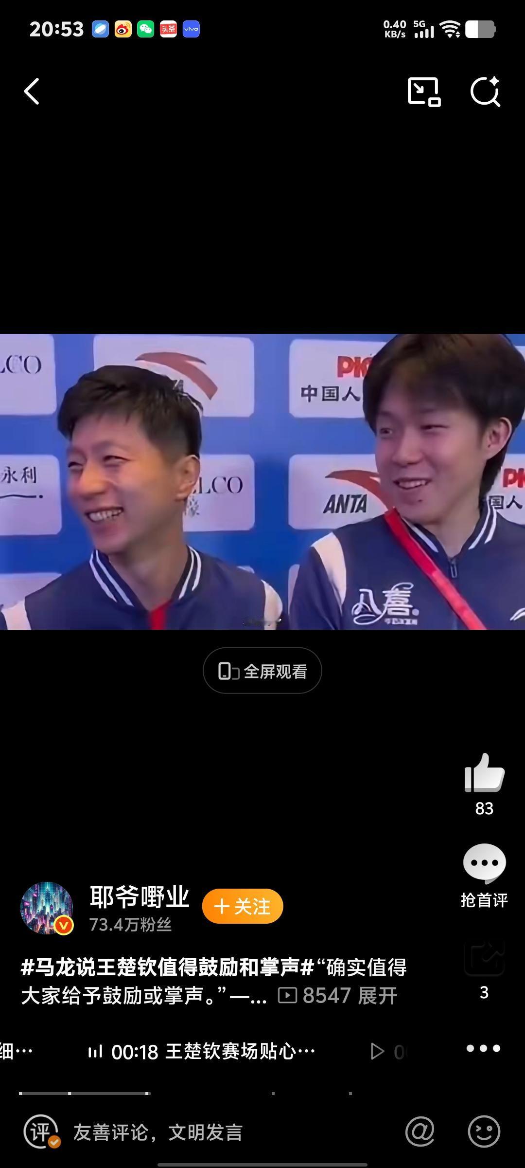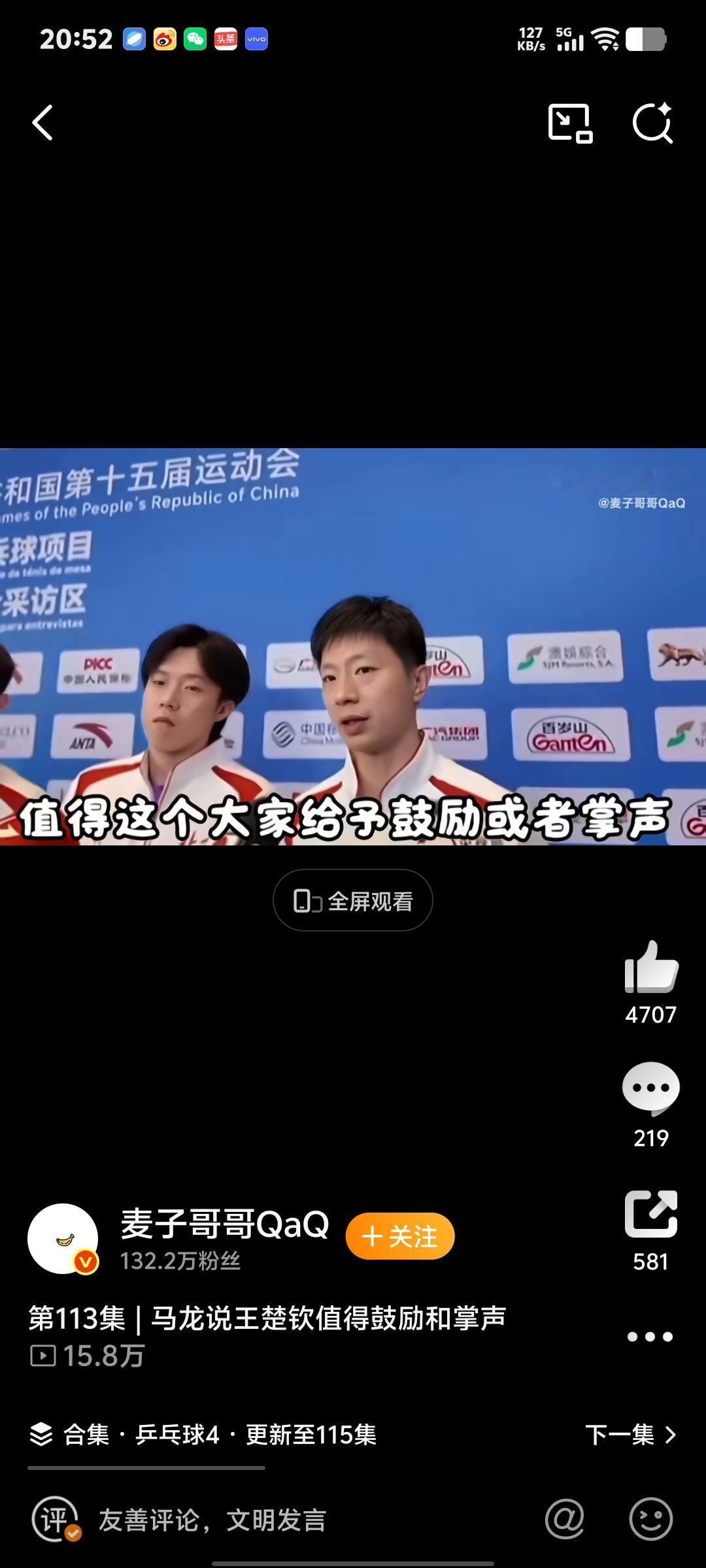 马龙盛赞王楚钦!全运会首单失利后火速调整状态,决胜局逆袭拿下奖牌,超强抗压能力值得掌声~ 马龙说王楚钦值得掌声和鼓励。第一单输了。后面马上就调整状态。拿下决胜局。这种心态的调整是很难得的。 这次全运会大头获得了男单银牌。团体赛金牌。表现的很优秀。唯一的遗憾就是没拿下金牌。 不过大头的抗压能力是很强的。相信他会继续努力提高自己。为下一场比赛加油努力!