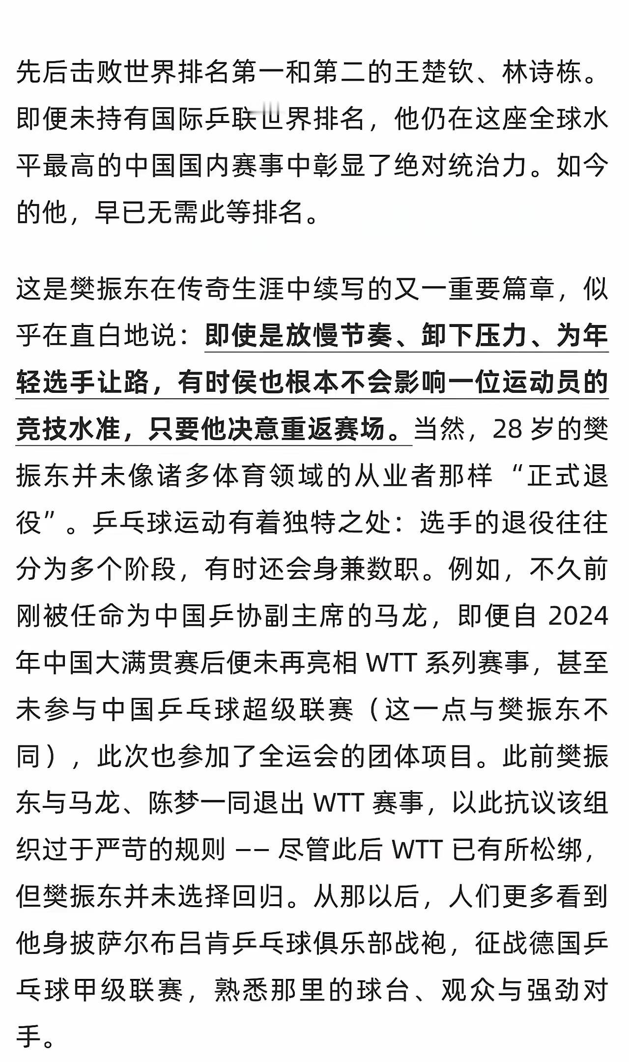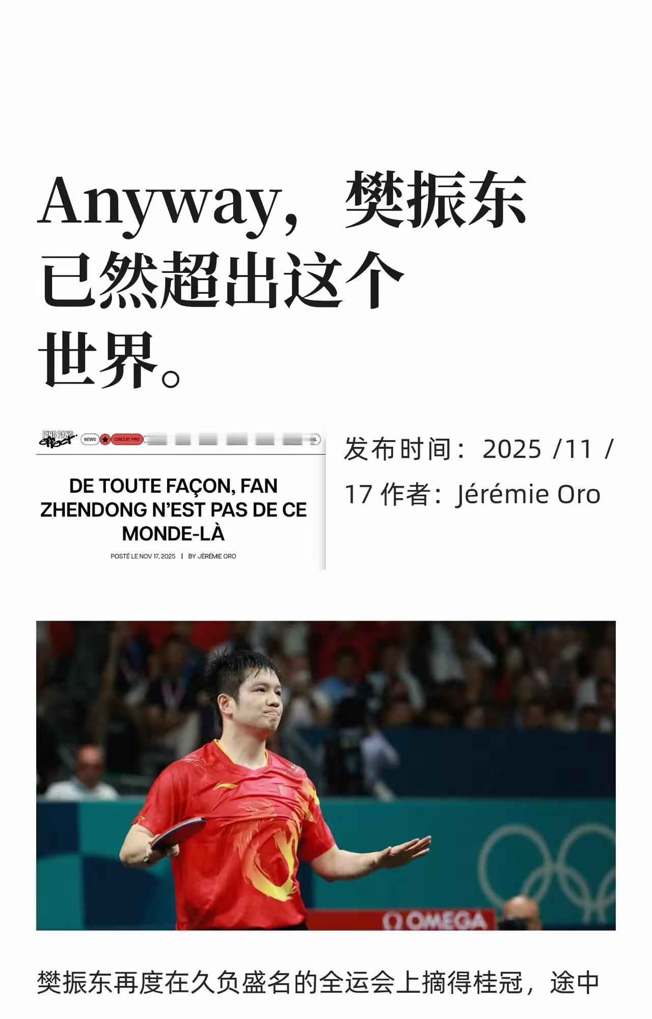小胖全运会九战全胜,十全十美,获得法媒盛赞。 法媒称,小胖击败世一和世二的头哥和小石头,已经彰显了他在中国国内赛事中的绝对统治力,根本不需要世界排名。 法媒总结得极其到位,这里还需要补充的是,小胖在全运会的突出表现,既彰显了他在中国乒坛的绝对统治力,也彰显了他在世界乒坛的绝对统治力,就像他在巴奥男单夺冠一样,只要他愿意重新返回国际大赛。 全运会