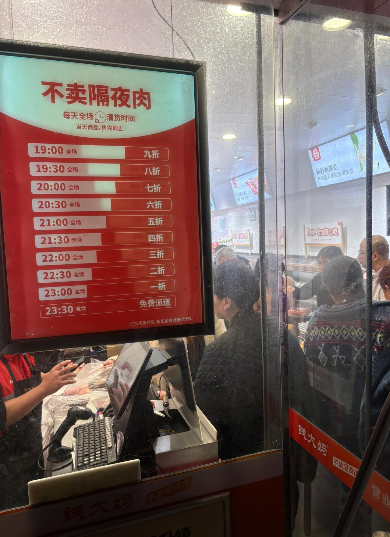 即使是寒冷的夜晚,到了9:00, 一个卖菜的连锁店门口依然是人头涌动。 我看了一下店外面的广告, 原来晚上9:00打五折。 哪个消费者不愿意用实惠的价格来消费呢? 买一根排骨,每天的时候要40块钱, 现在买只要20块钱。 不卖过夜菜,或是这家店火爆的原因吧。