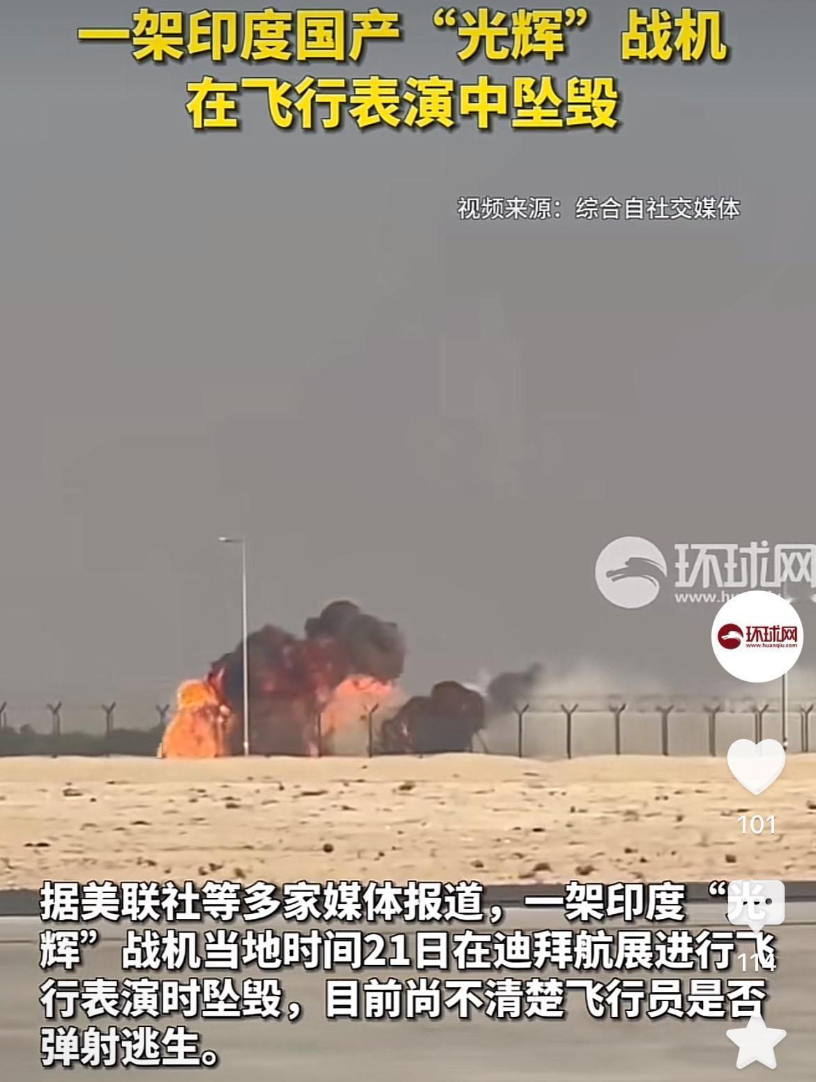 阿联酋迪拜航展最后一天,一架印度国产“光辉”战机在飞行表演时直接坠毁,现场火光冲天。救援直升机赶到坠毁现场,飞行员未进行弹射逃生,估计凶多吉少! 印度这国产“光辉”战机,号称印度空军明珠, 从1983年立项研发到2010年首飞,耗时将近30年,这是世界上所有战斗机耗时研发最长的,这一点排名世界第一不为过。光辉战机顶着最强印度产4代机的名头,却从未参加实战! 印度五代战机