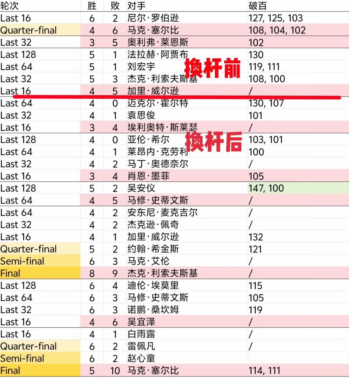赵心童夺冠的机会来了!利雅得邀请赛半决赛对阵球杆不顺手的特鲁姆普…… 新赛季至今,特鲁姆普饱受球杆问题困扰,利雅得邀请赛1/4决赛前,他临阵更换球杆,结果4-0大胜马威晋级四强。 赛后他透露,他还将继续寻找新球杆。图二是本赛季换球杆前后的战绩。