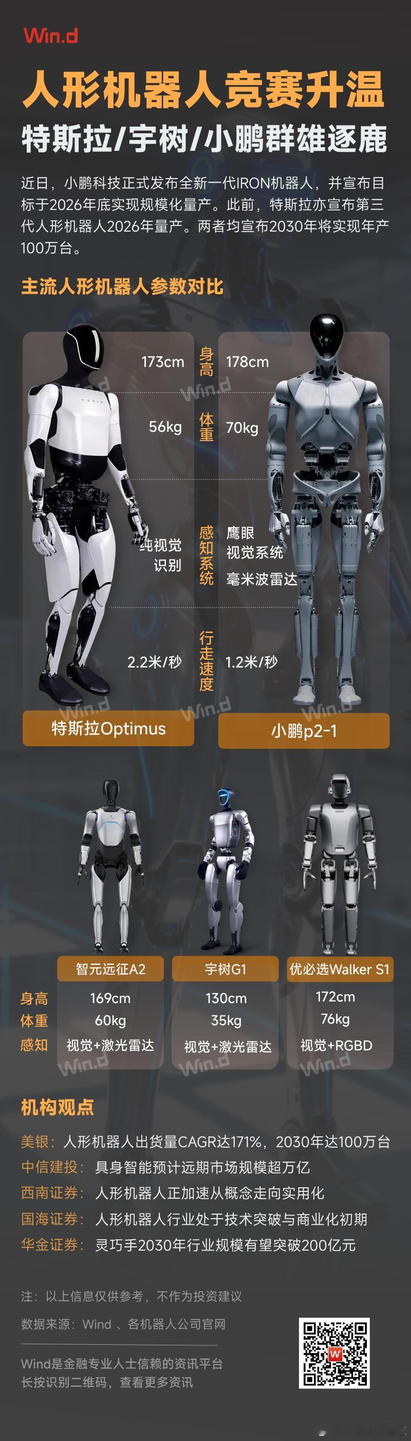 【万得图说】人形机器人竞赛升温近日,小鹏科技正式发布全新一代IRON机器人,并宣布目标于2026年底实现规模化量产。此前,特斯拉亦宣布第三代人形机器人2026年量产。两者均宣布2030年将实现年产100万台。