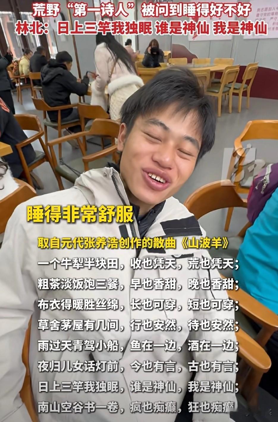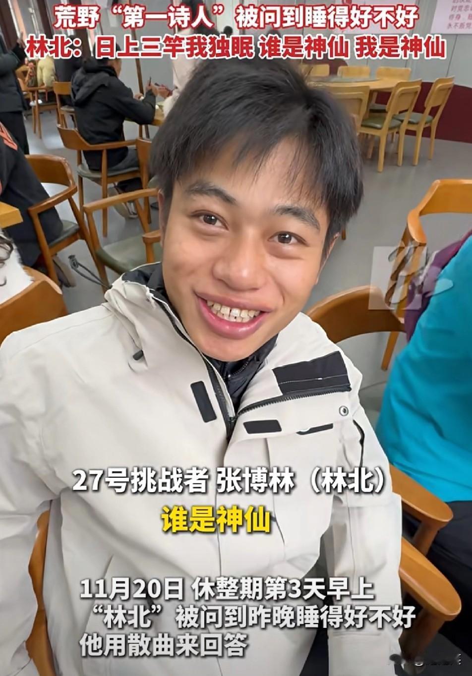 学中医的荒野挑战者 一张嘴把元曲给盘活了? 荒野挑战休整时被问“睡得咋样”,挑战者林北直接甩出元代张养浩的散曲 “日上三竿我独眠,谁是神仙我是神仙” 等网友扒出他是学中医的,这文学技能是背着大家偷偷点满的? 后来他攥着沾泥的零食 蹲在荒草里笑出褶子:“我是自己的Super monkey,你们得做自己的Super star” 糙日子被他过成诗 我们追的到底是“野生才子”的反差,还是把苦日子过顺的通透 这松弛感是演的,还是真活出来的 反正“中医+诗人+挑战者”这混搭,是把流量密码焊得死死的。荒野林北 林北荒野 你最看好七星山荒野求生中的谁 每日生活的感悟