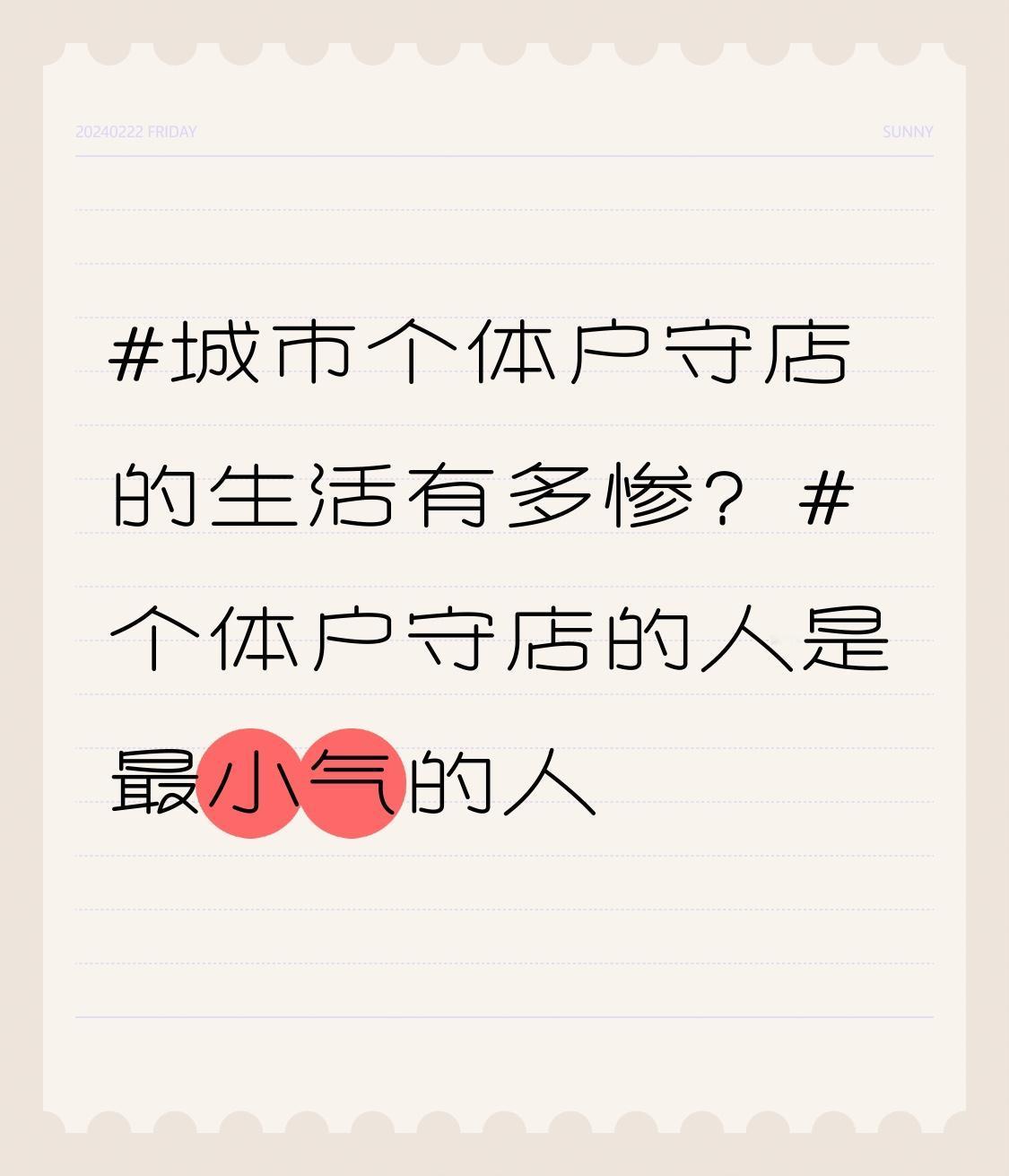说个体户守店的人小气,这可太冤枉了。守店人的日子,那真是一把辛酸泪。 他们每天起早贪黑,别人睡了他们还在守店,吃饭都没个准点,一年365天基本都耗在店里。交不完的房租、结不完的货款,压力山大。有生意走不开,没生意也不敢走,生怕错过大单。更别说陪家人了,节假日一家人聚餐都成了奢侈。 在乡镇开店的,还要面临激烈的竞争、电商冲击、市场整改和疫情影响,有时候连续几天没生意,愁得头发都白了。他们不是小气,是生活逼得太紧,每一分钱都得精打细算。
