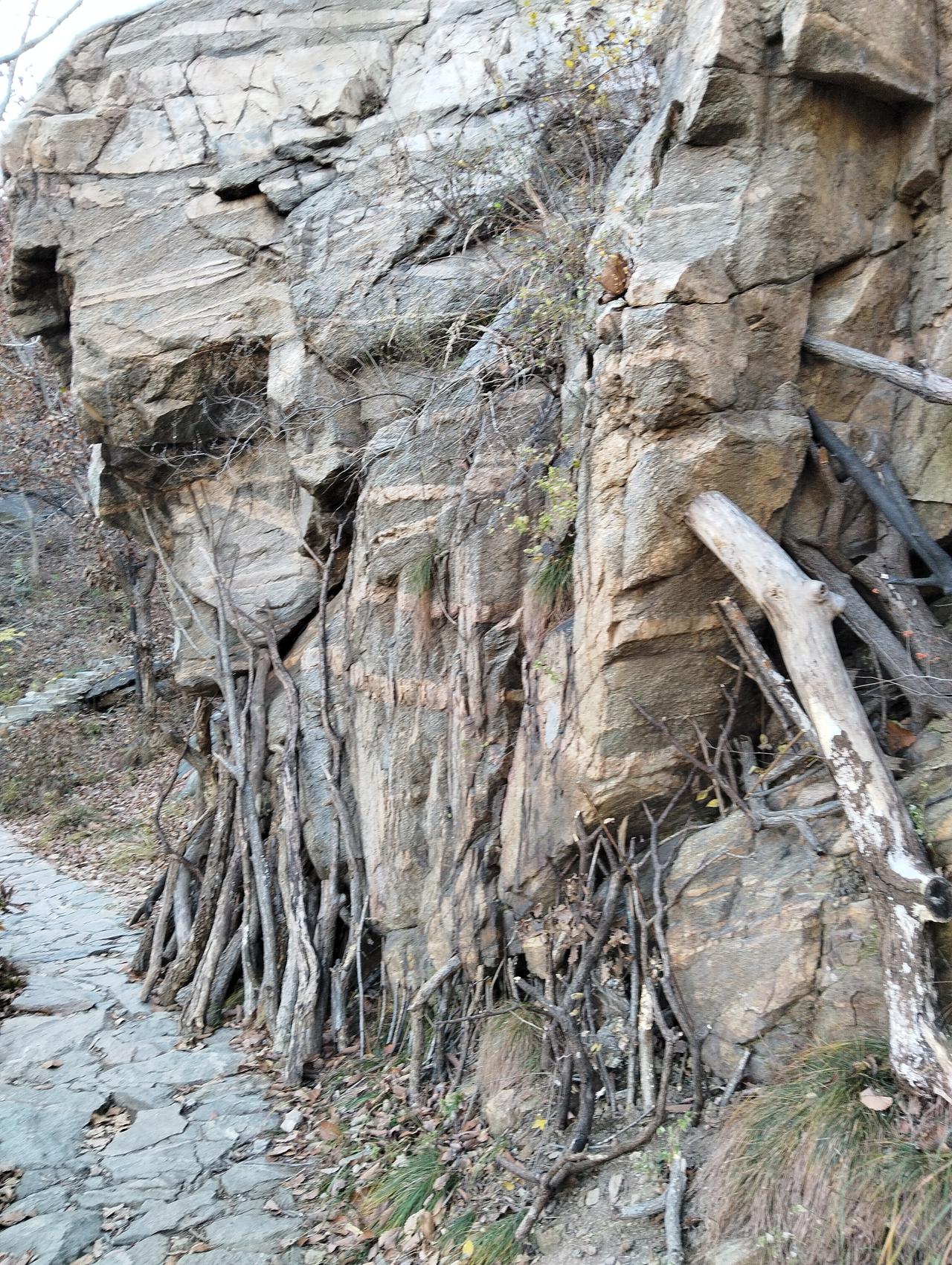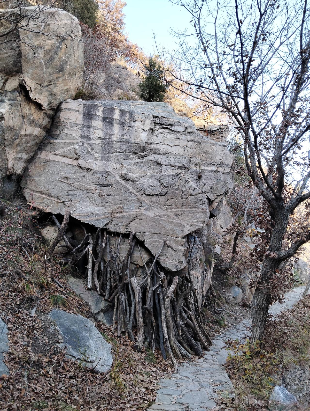 今天打卡福山区磁山南峰,用时二个半小时攀登上南峰《虎头峰》,坐在(指南针显示出)海拔501米的山峰上,吃了带去的两个五仁月饼。 在游途中,我对一个现象很好奇。有些摇摇欲坠的巨石,立方几十或几百米,重达几百吨的巨石下面,却支着一些木棍子。 这个细木棍能支住这个巨石吗?这是什么意思?只是一个意念,一个安慰,一个心理暗示,一个精神寄托吧?