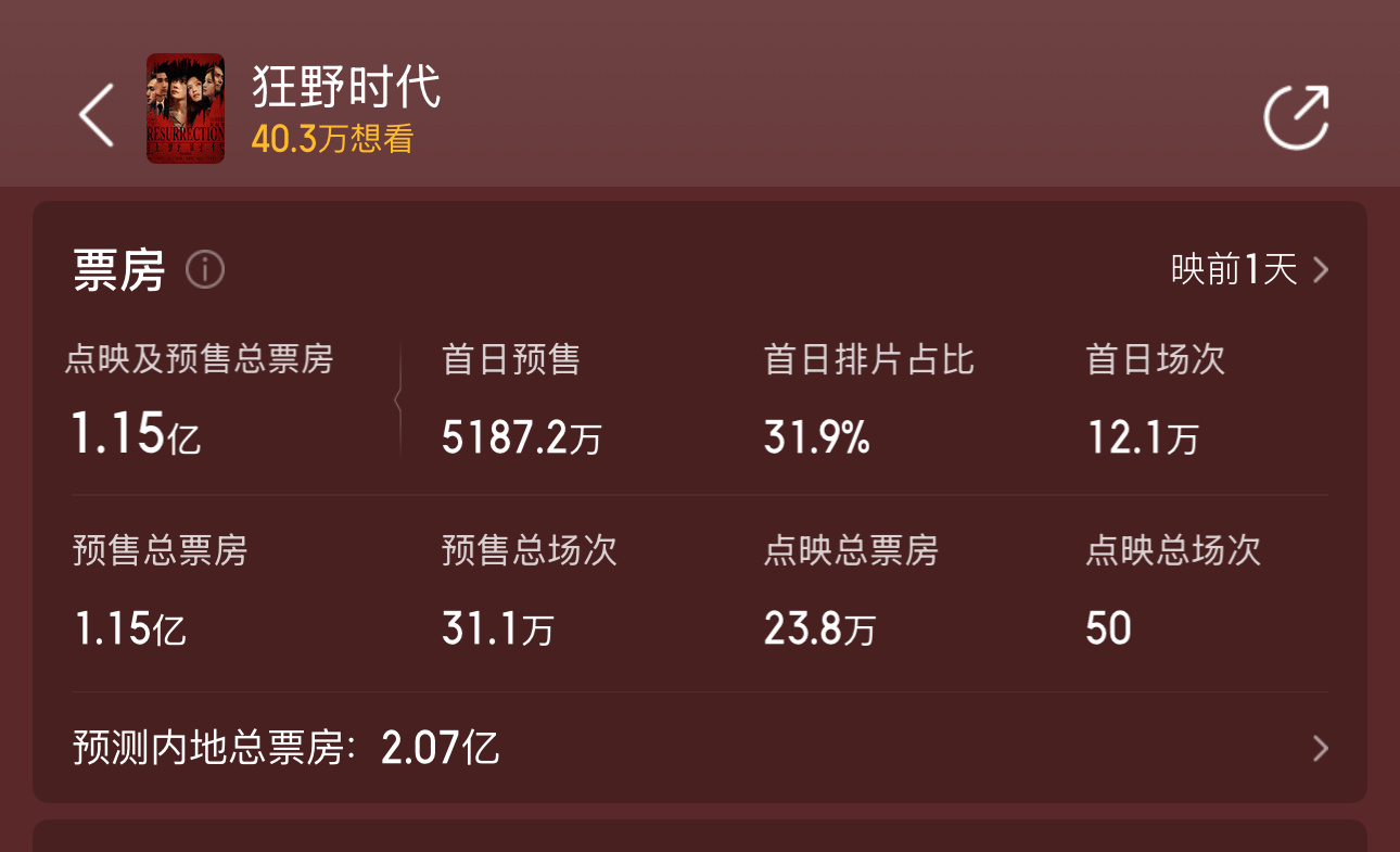 狂野时代第一天猫眼数据:点映+预售票房1.15亿预测总票房2.07亿