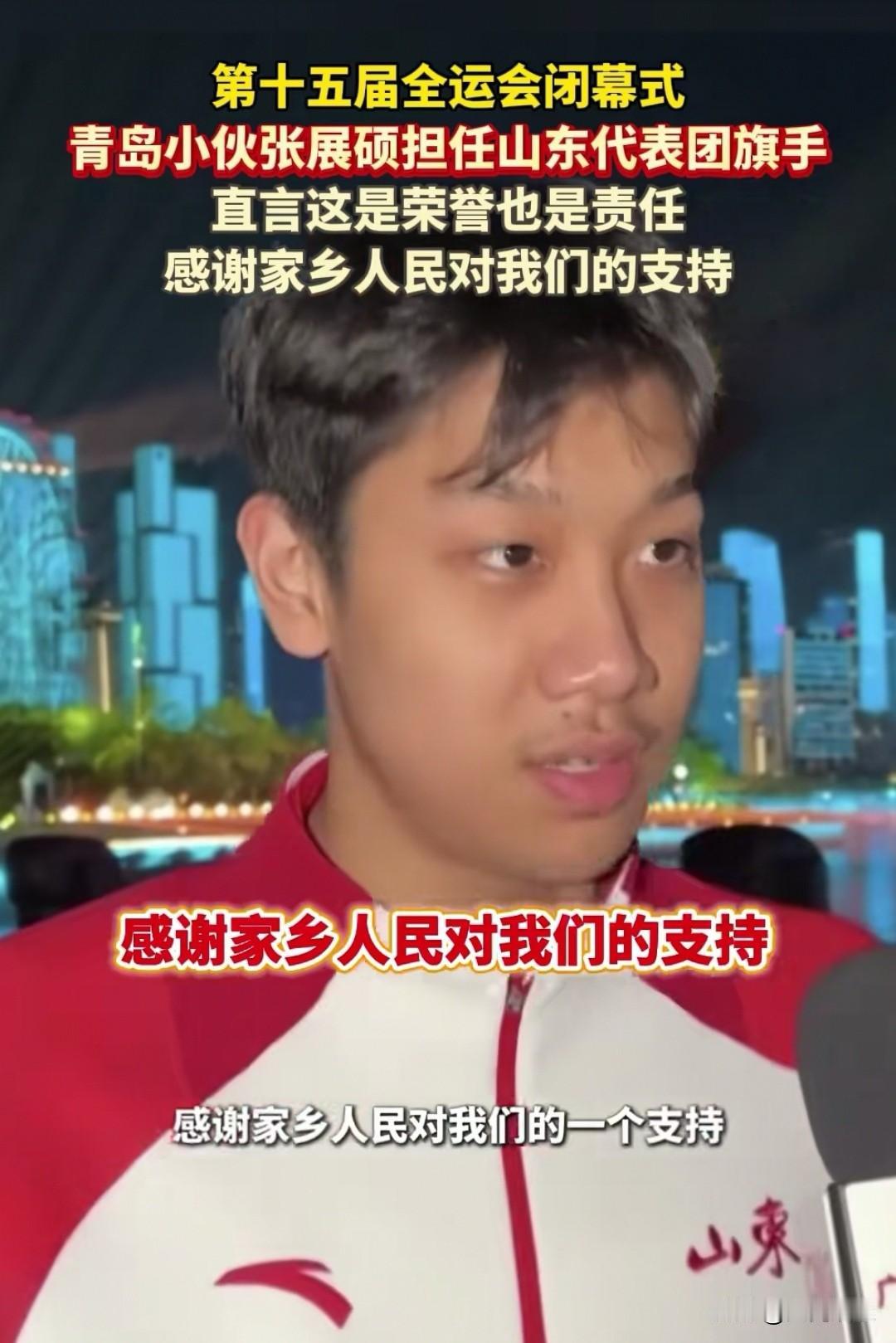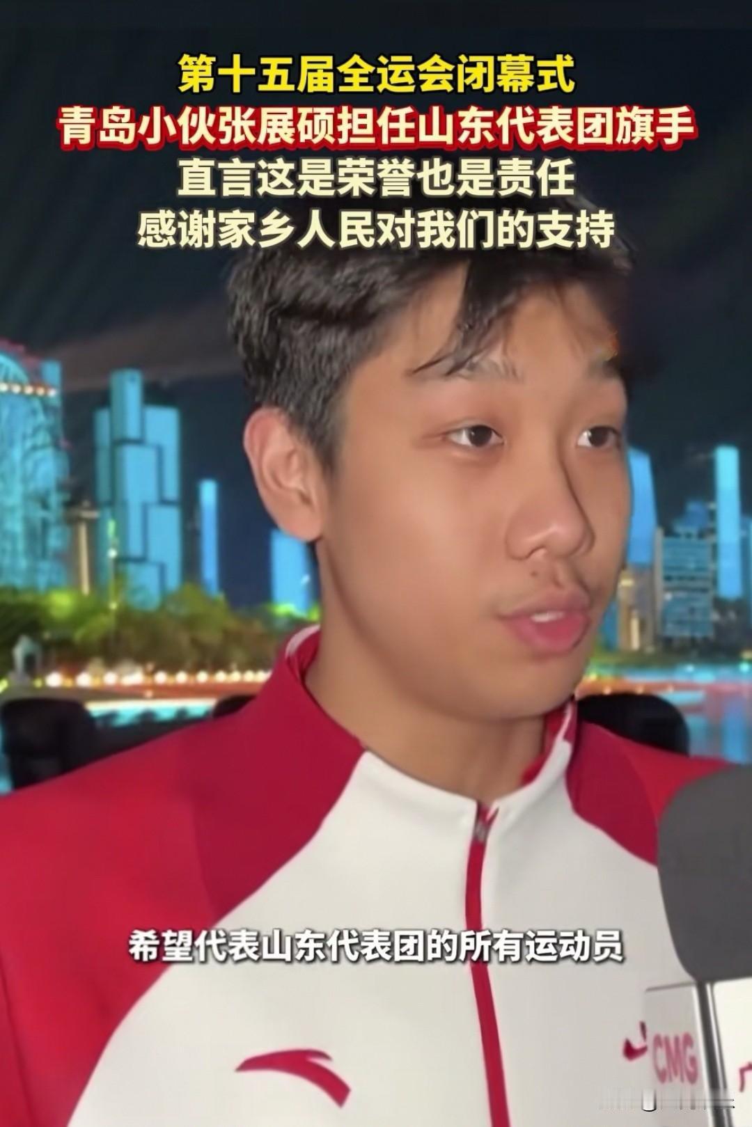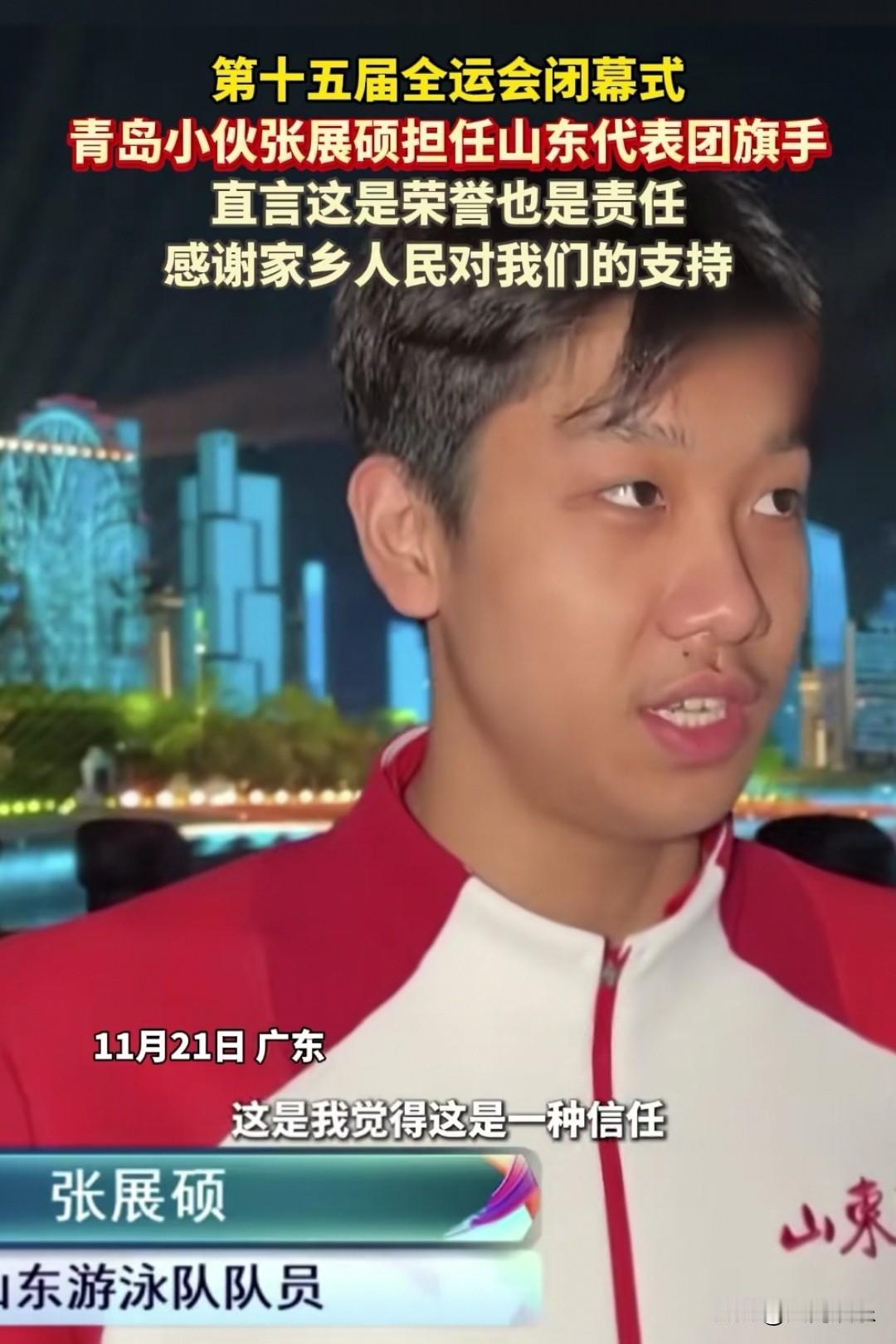 大家发现了吗?拿了五块金牌的青岛小伙张展硕虽然年轻,但他性格沉稳,面对记者的采访从容淡定,很符合山东人的性格特点。 记者问他担任全运会闭幕式山东代表团的旗手有什么感受,18岁的张展硕是这样说的: 我觉得这是一种信任,更是一份责任,当然我觉得这也是一种荣誉,也是对我今后训练的一个激励。 我希望代表山东代表团的所有运动员感谢家乡人民对我们的支持。 很多年轻运动员在接受采访时都很紧张,但张展硕说话条理清晰,眼神坚定,很多网友评论:不愧是复旦大学新闻学专业的高材生,这个小伙子未来可期!