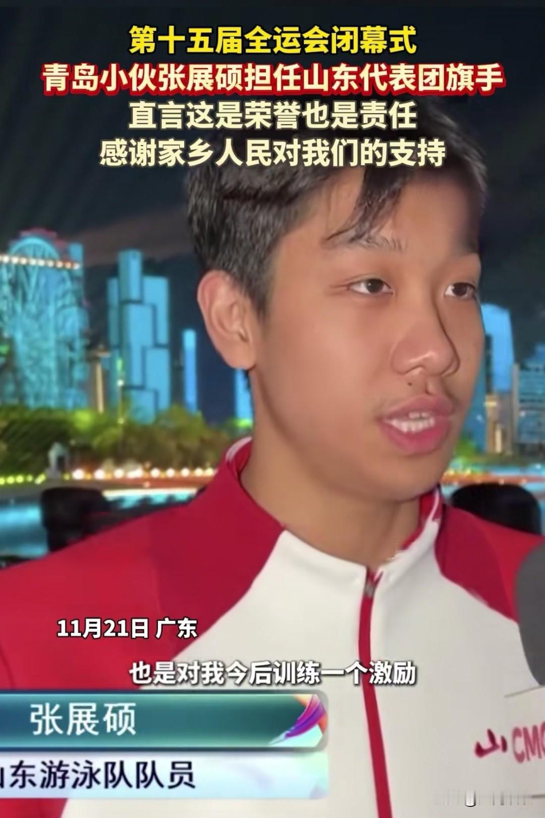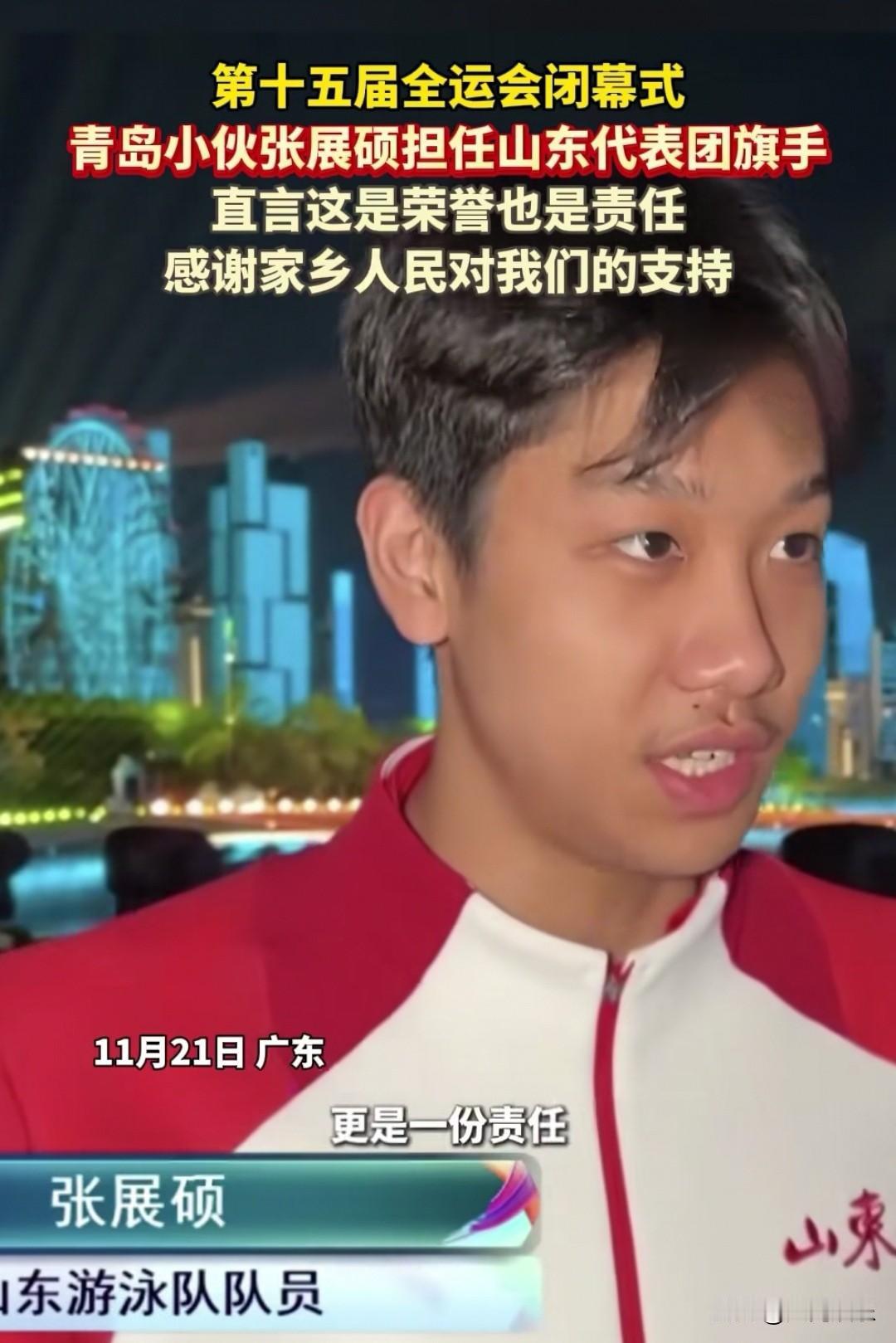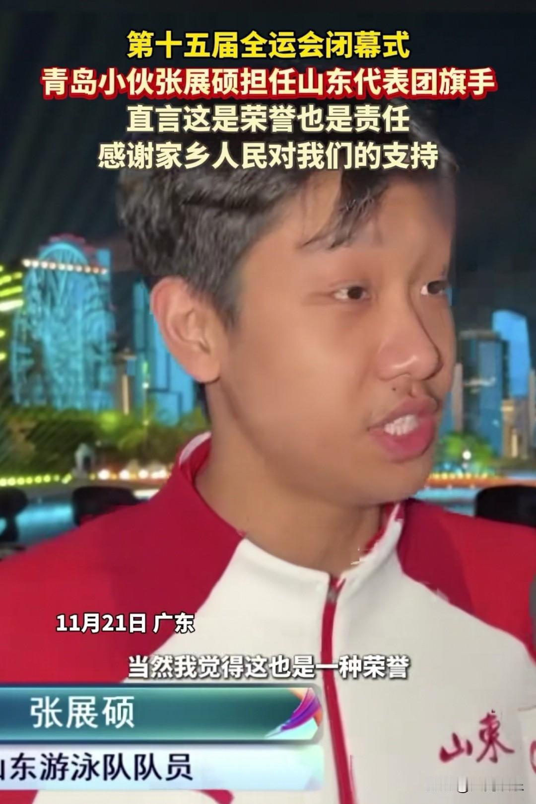 大家发现了吗?拿了五块金牌的青岛小伙张展硕虽然年轻,但他性格沉稳,面对记者的采访从容淡定,很符合山东人的性格特点。 记者问他担任全运会闭幕式山东代表团的旗手有什么感受,18岁的张展硕是这样说的: 我觉得这是一种信任,更是一份责任,当然我觉得这也是一种荣誉,也是对我今后训练的一个激励。 我希望代表山东代表团的所有运动员感谢家乡人民对我们的支持。 很多年轻运动员在接受采访时都很紧张,但张展硕说话条理清晰,眼神坚定,很多网友评论:不愧是复旦大学新闻学专业的高材生,这个小伙子未来可期!