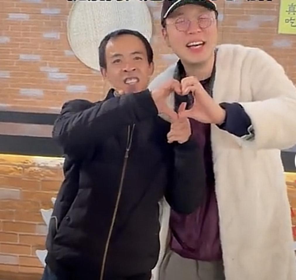 有些人红是有原因的, 杜海涛来到鸡排哥的小摊, 鸡排哥的反应着实令人惊讶,他没有特别的紧张,而是全程落落大方,言行让人舒服又不卑不亢。 杜海涛过来时很兴奋的问:你喜不喜欢我。 鸡排哥很淡定的说:你是我的偶像,如果可以的话给我一次机会合个影。 是不是真的偶像不清楚,但是鸡排哥话说的的确好听。 杜海涛和鸡排哥合照时打算两人举起手臂比心,但是由于身高差,对鸡排哥来说这个动作肯定是有点不好做的。 鸡排哥聪明的说我是这种比心,两只手做了个比心的手势,于是杜海涛也配合他一人出一只手合比一个心。 鸡排哥面对明星时的淡定从容一般人真的挺难做到。