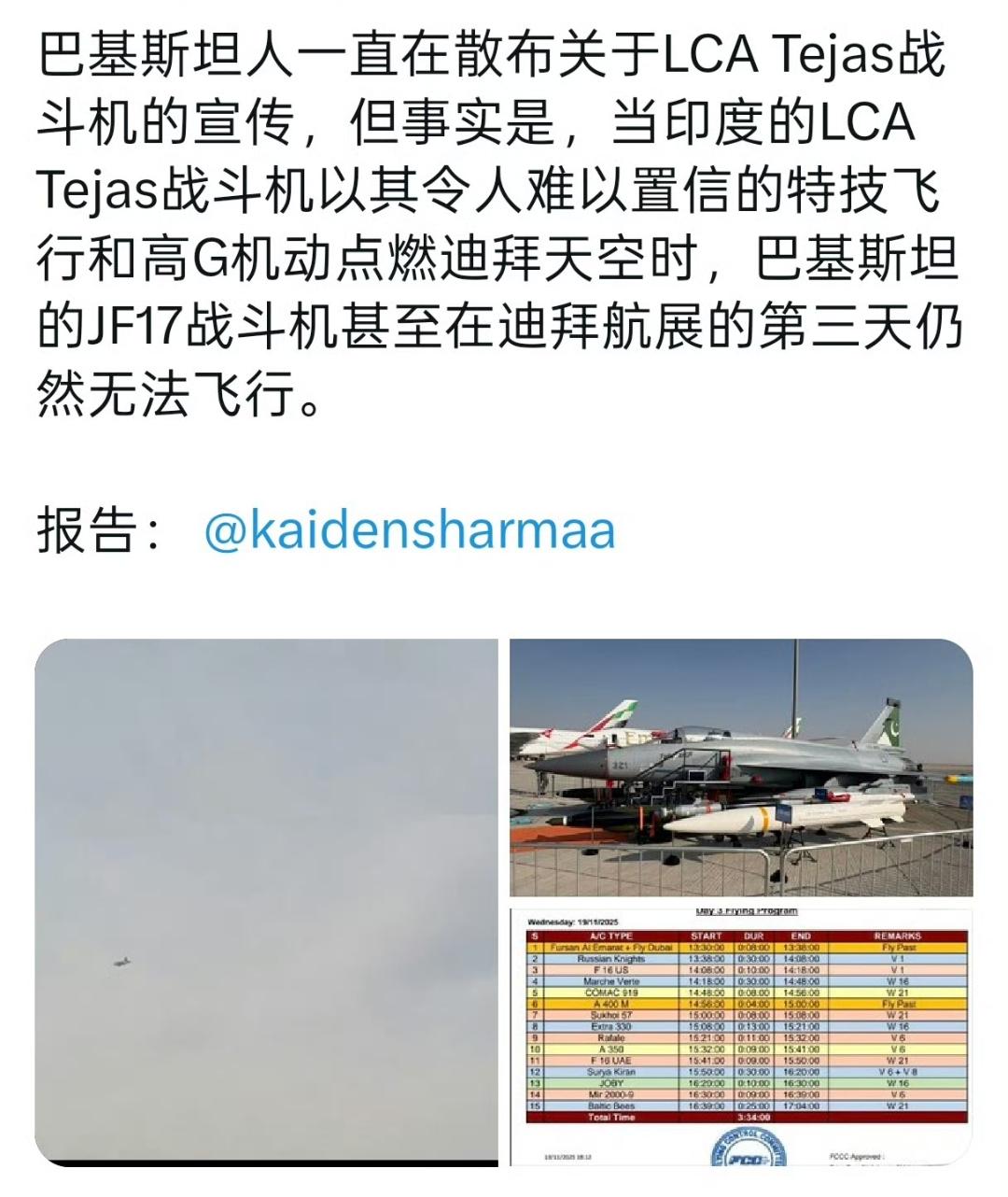 这个照片就有点地狱了[捂脸] 印度网友还在拼命宣传自己的光辉战斗机,把自己的光辉战斗机与巴基斯坦展出的枭龙战斗机对比,这个网友还在嘲笑枭龙战斗机,并没有进行飞行展示。 然而这个印度网友发出该文章没有多久,大家就看到了光辉战斗机在迪拜航展坠机的新闻。 现在这个印度的网友的主页也不可见,他自己给关闭了。各位是怎么看的?欢迎评论区留言。