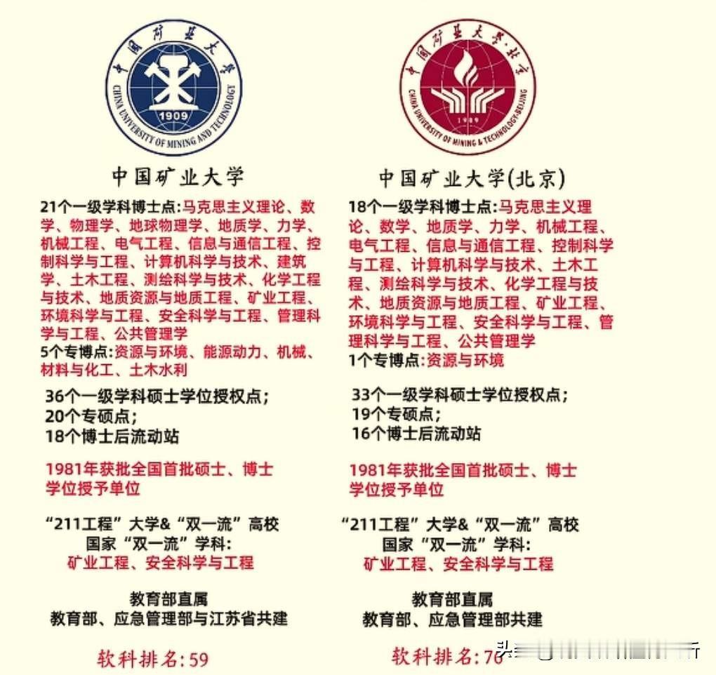 这是全国仅有的两所矿业大学,一所位于江苏徐州的中国矿业大学和一所位于北京的中国矿业大学(北京)。徐矿和北矿 二者同根同源,2003年中国矿业大学北京校区成为教育部直属的独立办学实体,命名中国矿业大学(北京)。要是当初北京校区没独立出去,中国矿业大学现在肯定会更强。