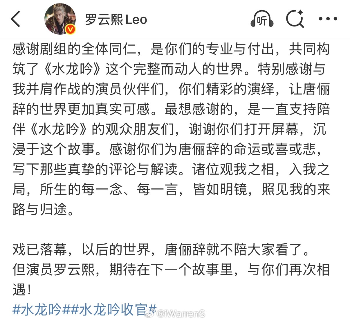 罗云熙收官文告别水龙吟唐俪辞了……最好的唐俪辞!最好的罗云熙!期待下个角色啊!