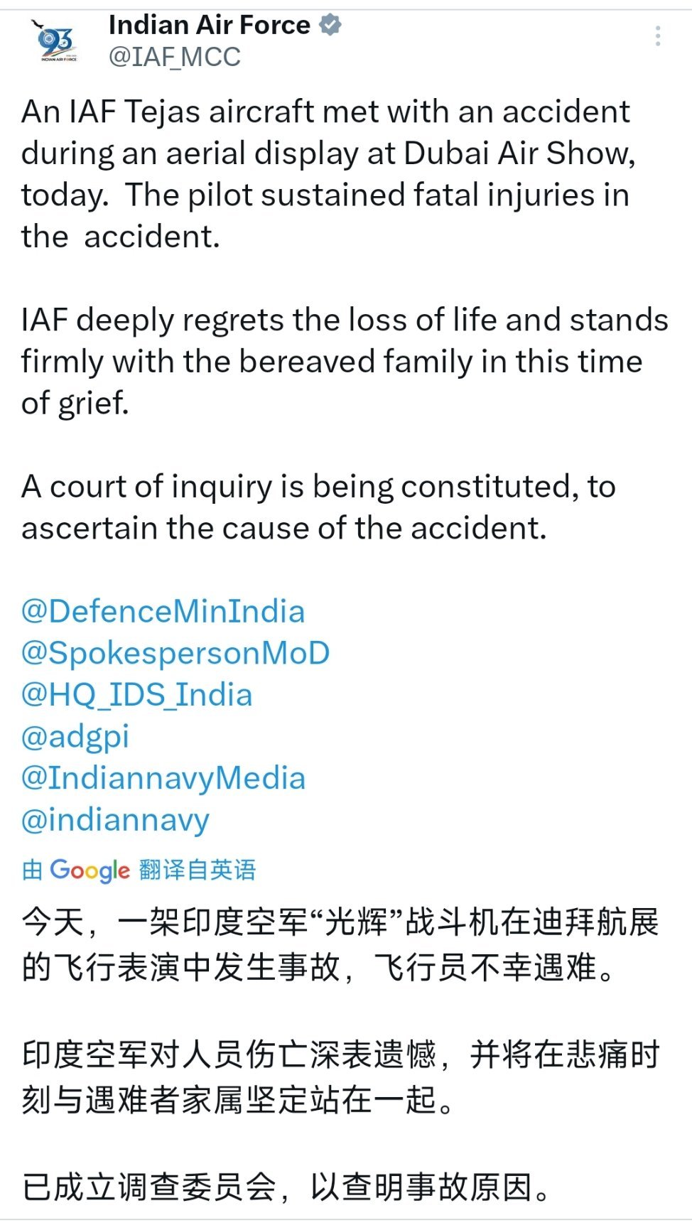 🇮🇳印度空军官推证实在迪拜航展现场坠毁的LCA飞行员已死亡