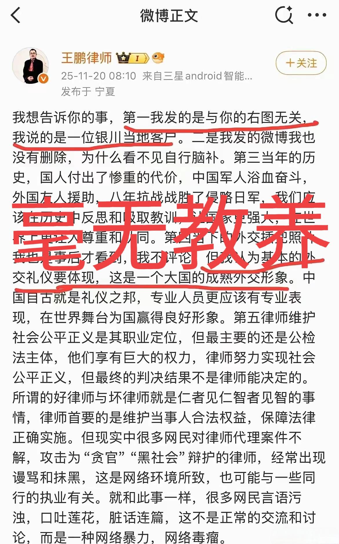 开始给自己找补了,他要是大骂日本一顿,也算找补的有效,可他先是不承认辱骂外交人员,说是骂客户,然后还是批评外交人员插兜不专业,这不是欲盖弥彰吗?他还嫌网友口吐莲花,他是忘了自己上一篇在说别人毫无教养吗?他的逻辑是,说别人毫无教养不算骂人是吗?那好,我也说一句,王鹏律师毫无教养。 外交时评 无礼貌外交 破坏外交 无理由回怼外交时评