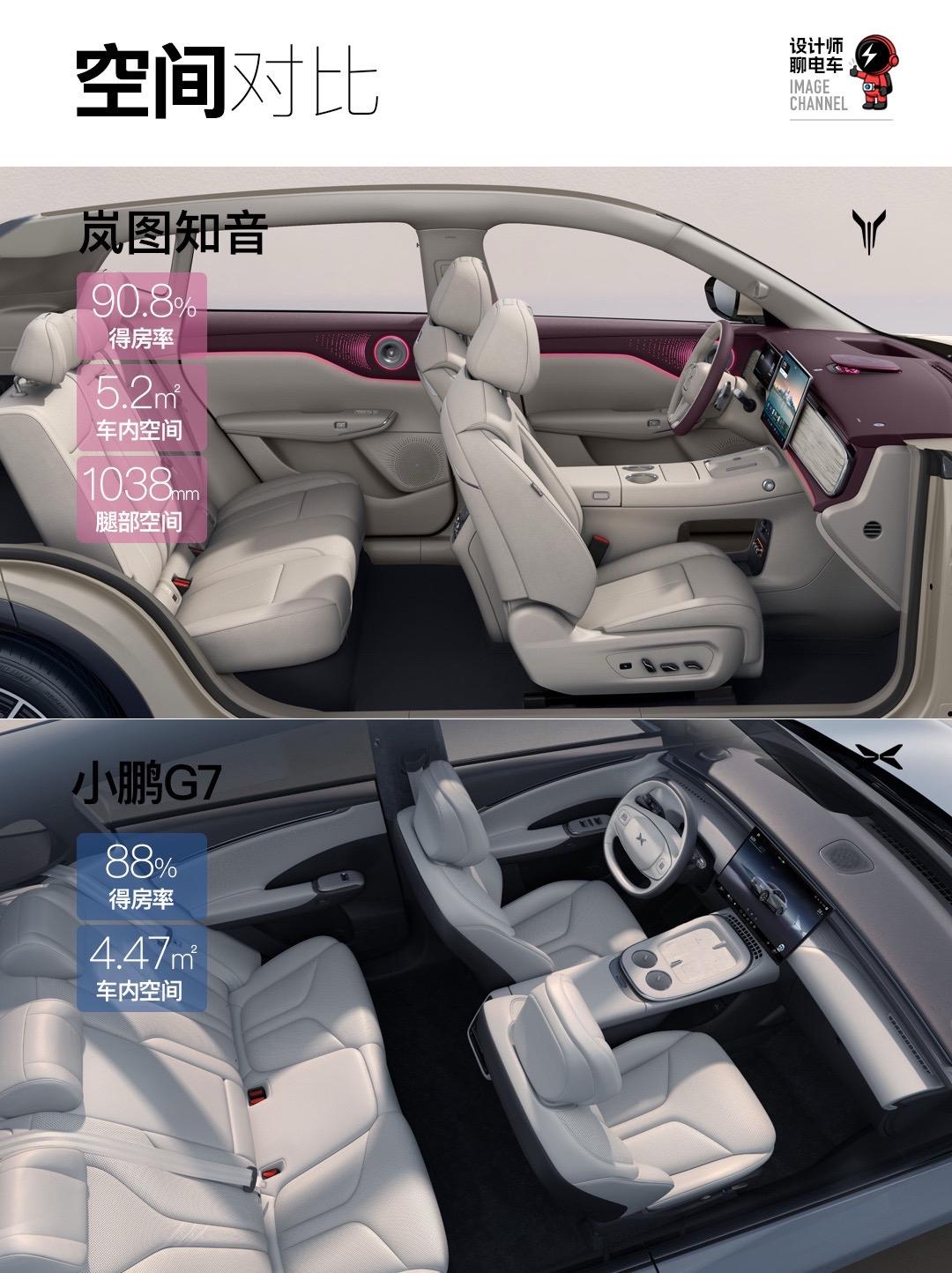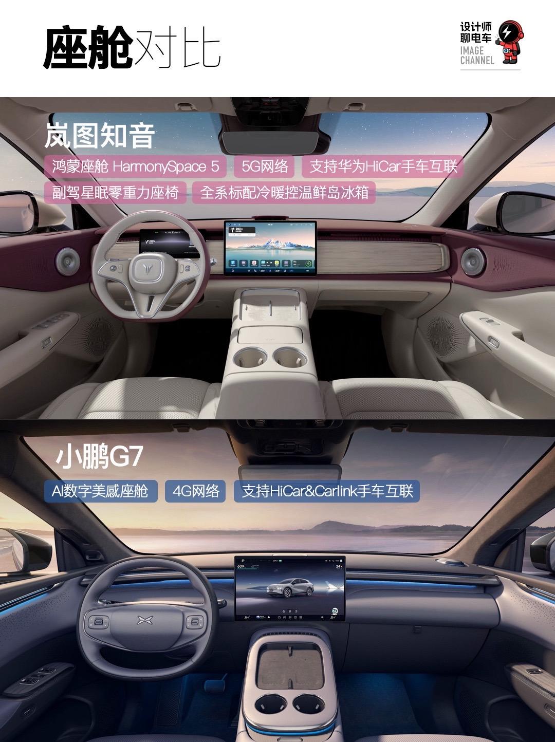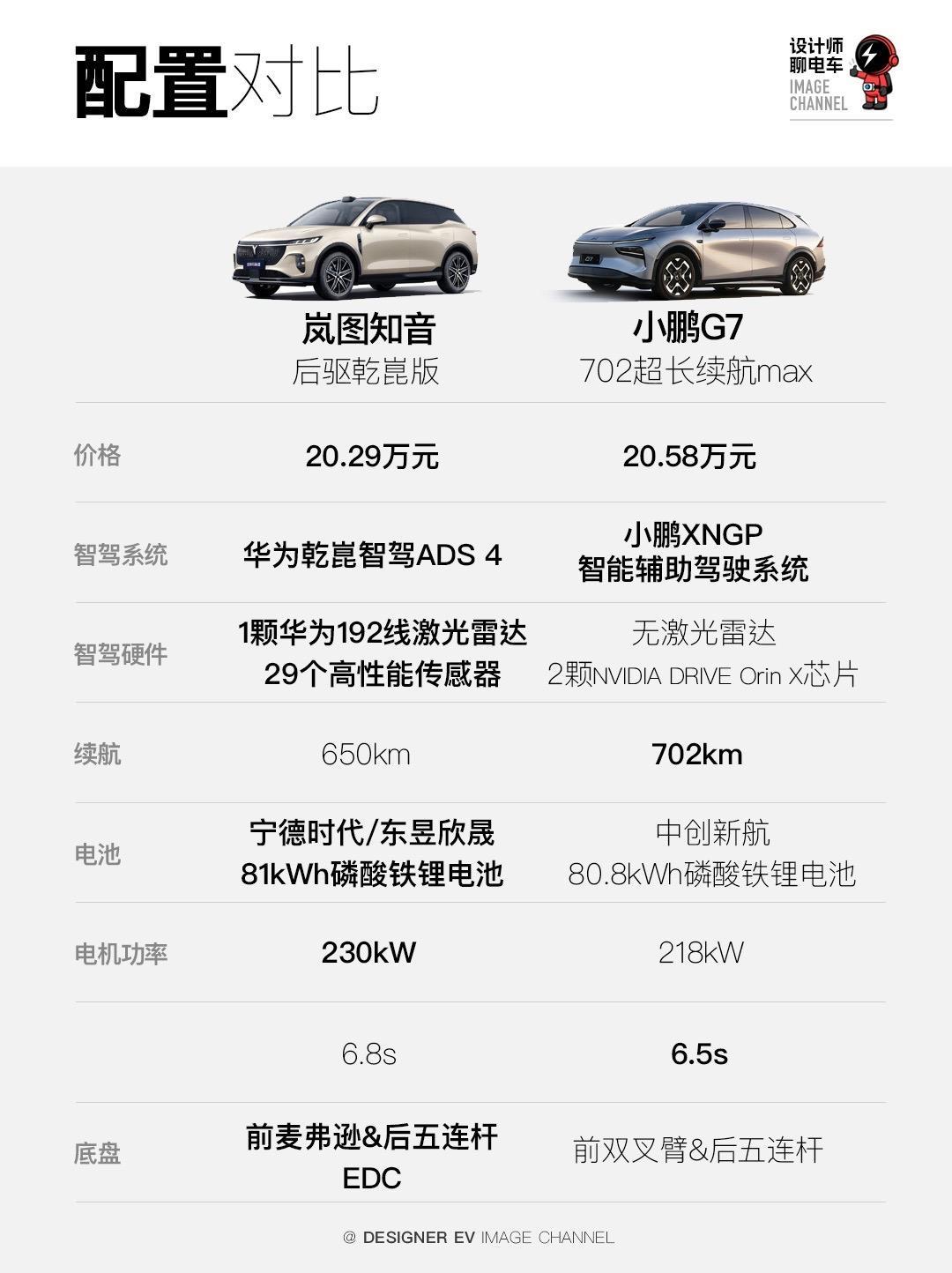 20万级纯电决赛圈 岚图知音VS小鹏G7。搭载华为乾崑智驾ADS 4的全新岚图知音上市后立马成为这个价位区间的的热门车型,手握20万左右到底该选岚图知音后驱乾崑版还是小鹏G7 702超长续航max版呢?   【外观空间】 岚图知音:整体造型设计非常饱满,2925mm的轴距让车内空间非常富裕,90.8%的得房率傲视群雄,5.2㎡车内空间,后排也能轻松跷二郎腿。 小鹏G7:家族式设计,车身相比要大一些,后备箱空间也更大,2890mm的轴距使得后排空间稍逊一筹,得房率88%,车内空间为4.47㎡。 【智能驾驶辅