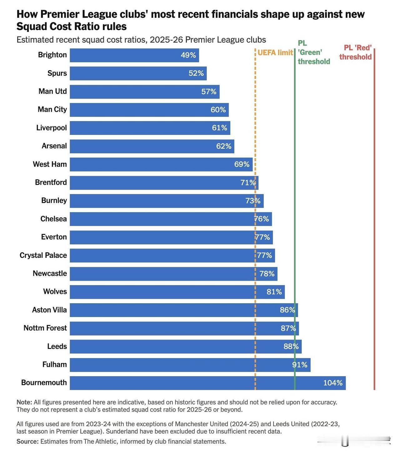 英超俱乐部投票决定从 2026-27 赛季开始对联赛的财务规则进行全面改革。 球队成本比率 (SCR) 将取代联赛目前的盈利能力和可持续性规则 (PSR),该规则将俱乐部三年内的亏损限制在 1.05 亿英镑(1.37 亿美元)以内。 不同俱乐部的阵容成本比率差异明显,选取部分代表性数据: - 不莱顿:49%(远低于欧足联限制,也低于英超两条门槛); - 托特纳姆热刺:52%; - 曼彻斯特联:57%; - 曼彻斯特城:60%; - 利物浦:61%; - 阿森纳:62%; - 西汉姆联:69%; - 布伦特福德:71%; - 伯恩利:73%; - 切尔西:76%; - 埃弗顿:77%; - 水晶宫:77%; - 纽卡斯尔联:78%; - 狼队:81%; - 阿斯顿维拉:86%; - 诺丁汉森林:87%; - 利兹联:88%; - 富勒姆:91%; - 伯恩茅斯:104%(唯一起过红线的俱乐部,比率最高)。