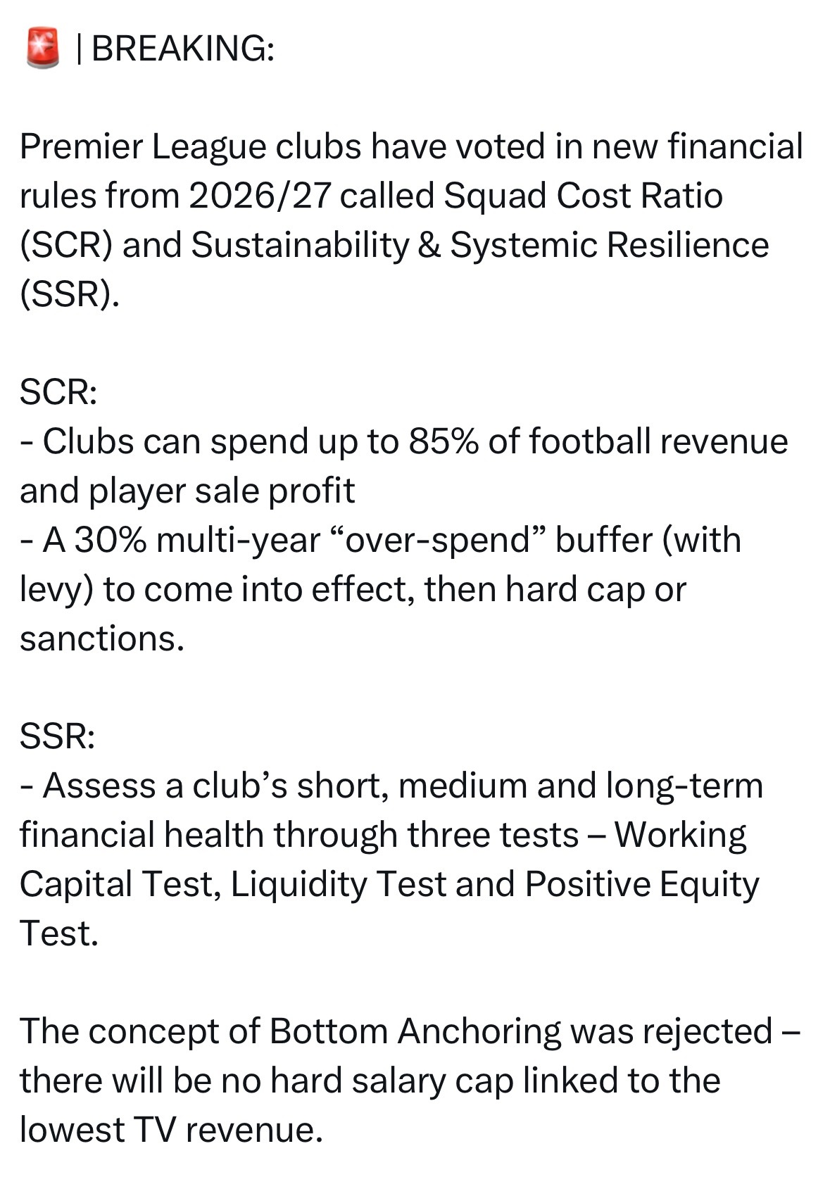 英超财政新规,如果以下正文太晦涩,可以看我的解读版:1、土豪充钱球队一夜乌鸦变凤凰的不带玩2、球队举债买买买,博一个空手套白狼的不带玩3、英超球队CFO职位的含金量还在上升————————英超俱乐部已投票通过2026 - 2027赛季起生效的两项全新财务规则,分别为阵容成本比率(SCR)与可持续及系统性抗风险规则(SSR)。阵容成本比率(SCR)相关规定:1. 俱乐部最多可将足球业务收入与球员出售利润的85%用于相关支出;2. 设有30%的多年度超额支出缓冲额度(违规需缴纳罚款),超出该额度后将触发硬性额度限制或相关处罚。可持续及系统性抗风险规则(SSR)相关规定:1. 通过三项测试评估俱乐部的短期、中期及长期财务状况,具体包括营运资金测试、偿债能力测试及净资产为正测试。此次投票同时否决了“底线锚定”机制,英超将不会设置与最低转播收入挂钩的硬性薪资上限。