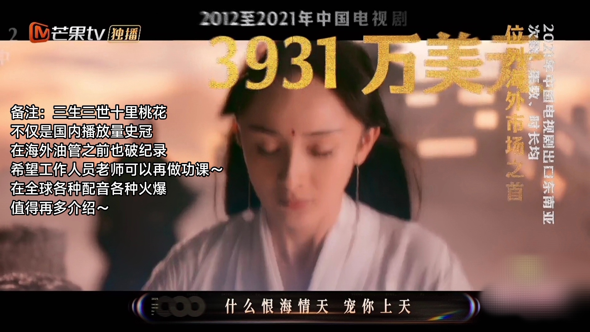 《声生不息华流季》首期,介绍出海影视剧时出现的杨幂作品,然后还唱了仙剑三的ost歌曲,用的杨幂和男主海报。首先夸一夸节目组,看这些vcr都挺好玩的。今天看华流季也看到了爆剧王👸🏻杨幂的作品镜头,挺高兴的~(毕竟她的大爆剧真是多到几乎所有综艺都有提及,不可避开的大爆剧太多了。) 但还希望下次多做一些介绍,说起华流,三生三世十里桃花可是创造过华剧播放史冠的,全球大爆剧,值得更详细的介绍