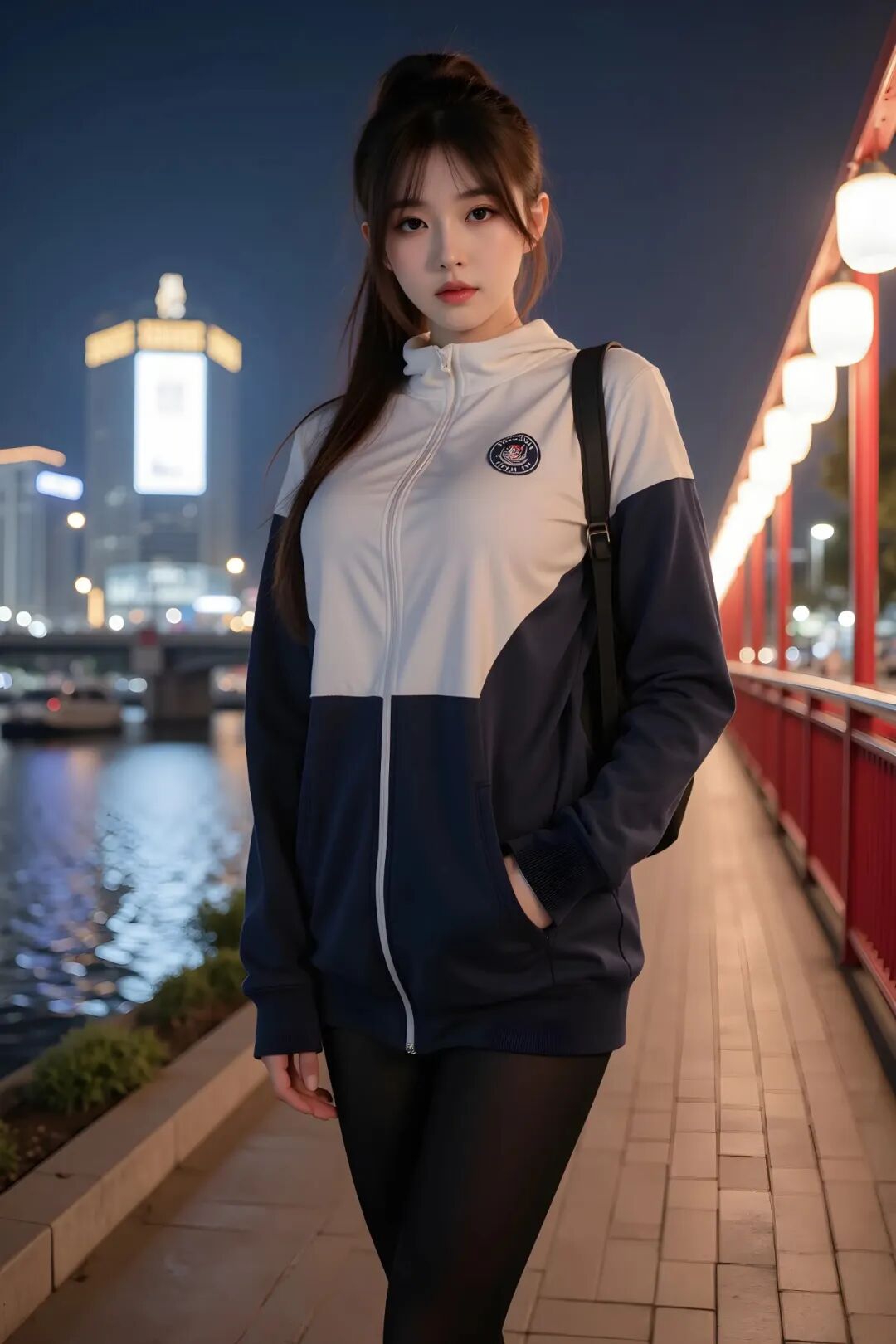 夜晚的都市街头,时尚少女漫步在灯火阑珊处。